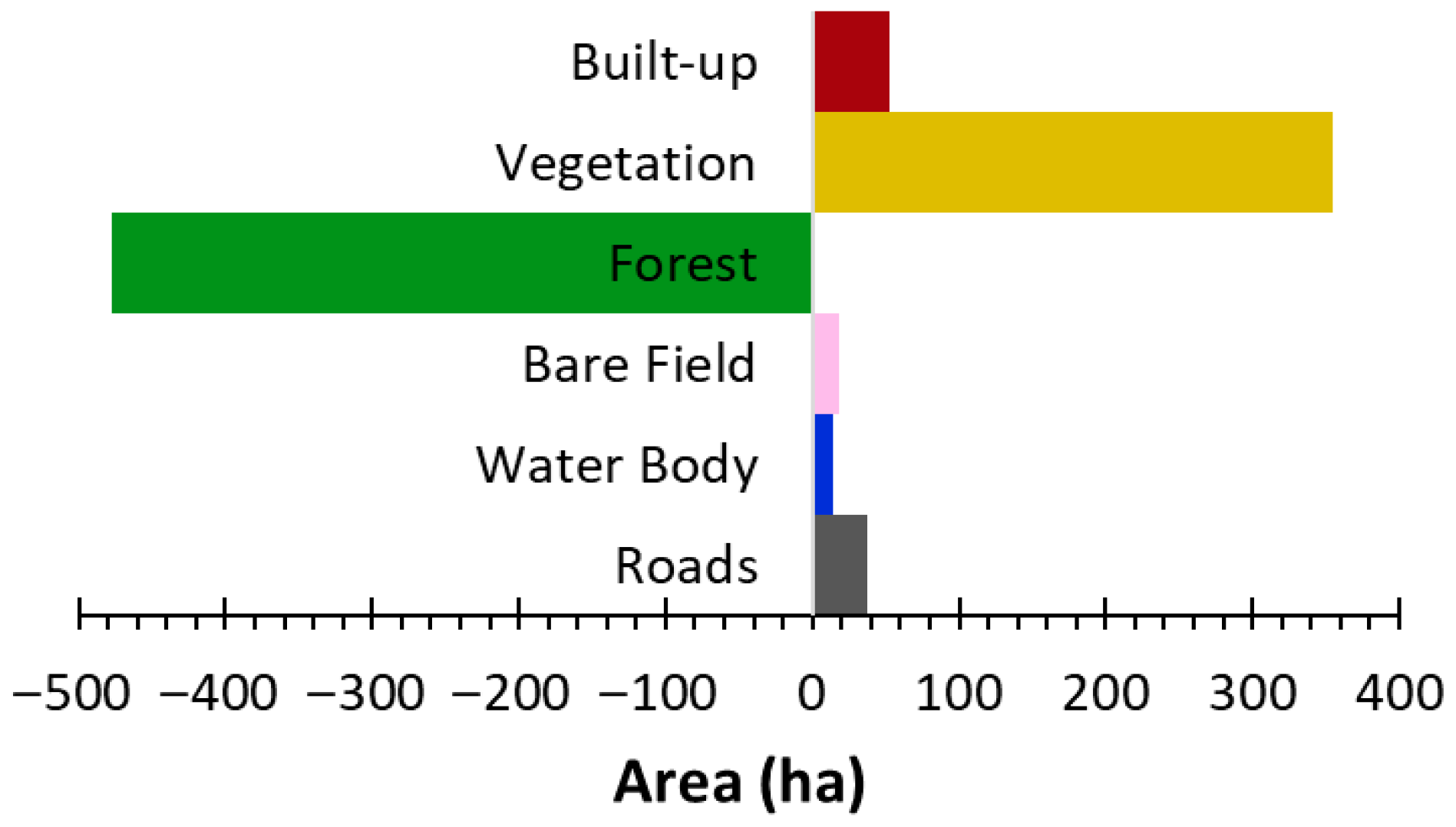 The progress in remote sensing and Geographic Information System (GIS) technologies has greatly improved the accuracy and reliability of tracking and simulating land use changes. In [40], land use dynamics in Thimphu were analyzed using Landsat satellite imagery and projections up to 2050 were produced with the CA–Markov method. In [41], land use changes in Makassar were predicted through to 2031 using Multi-Layer Perceptron Neural Network (MLPNN) and CA–Markov models, showing a significant increase in settlement areas. In [42], remote sensing and GIS were used to forecast land use changes in 2025 and 2036 with the CA–Markov model, predicting a decrease in forested areas. In [43], substantial losses in forest and wetland areas and an increase in urban areas in Northwest Xinjiang, China, were identified up to 2030 using ANN and MOLUSCE. A study carried out in the Mand watershed of Chhattisgarh in [44] used GIS-based supervised classification for the years 2001 and 2021. The MOLUSCE plugin was used to generate future projections for 2030 and 2040 using the Cellular Automata–Artificial Neural Network (CA–ANN) model. The results showed an apparent increase in populated and agricultural areas and a decrease in bare land and dense forest [44]. In [45], changes in land cover in and around Nairobi National Park, Kenya, were examined from 2016 to 2023 and changes through to 2040 were projected. The Random Forest algorithm was used to classify the Landsat imagery, and the CA–ANN model was employed to predict future changes, with an overall accuracy of 84.4%. The findings highlight the importance of integrated land use planning and conservation policies by showing an increase in built-up and agricultural areas and a predicted decline in forest, shrubland, water bodies, and bare soil [45].