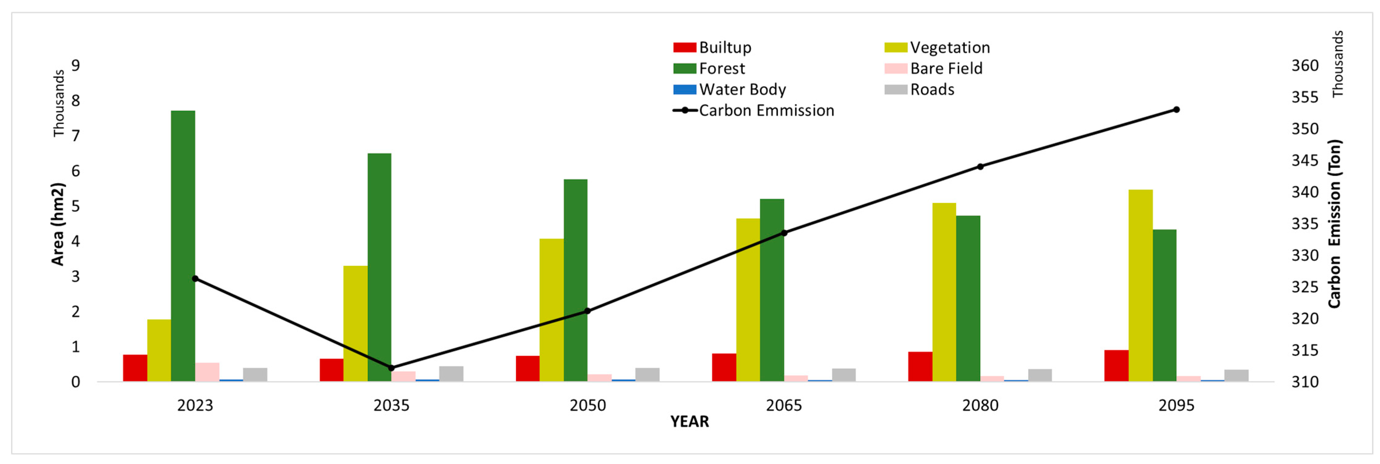 Indirect carbon emissions were included in the study by following the method in [74], which allocates Istanbul-wide total carbon emissions from natural gas and electricity use to residential areas, thereby calculating the carbon emission per unit area. According to [74], in 2018, natural gas consumption reached 7,659,839,016.62 m3, while electricity consumption was 40,452,118.85 MWh. The total carbon emissions amounted to 38,896,800.00 tons. Since the residential area in 2018 was 137,940.00 ha, the direct carbon emission per unit area was 281.98 tons CO2/ha. The analysis was based on the assumption that these unit emissions will stay constant through to 2095.
