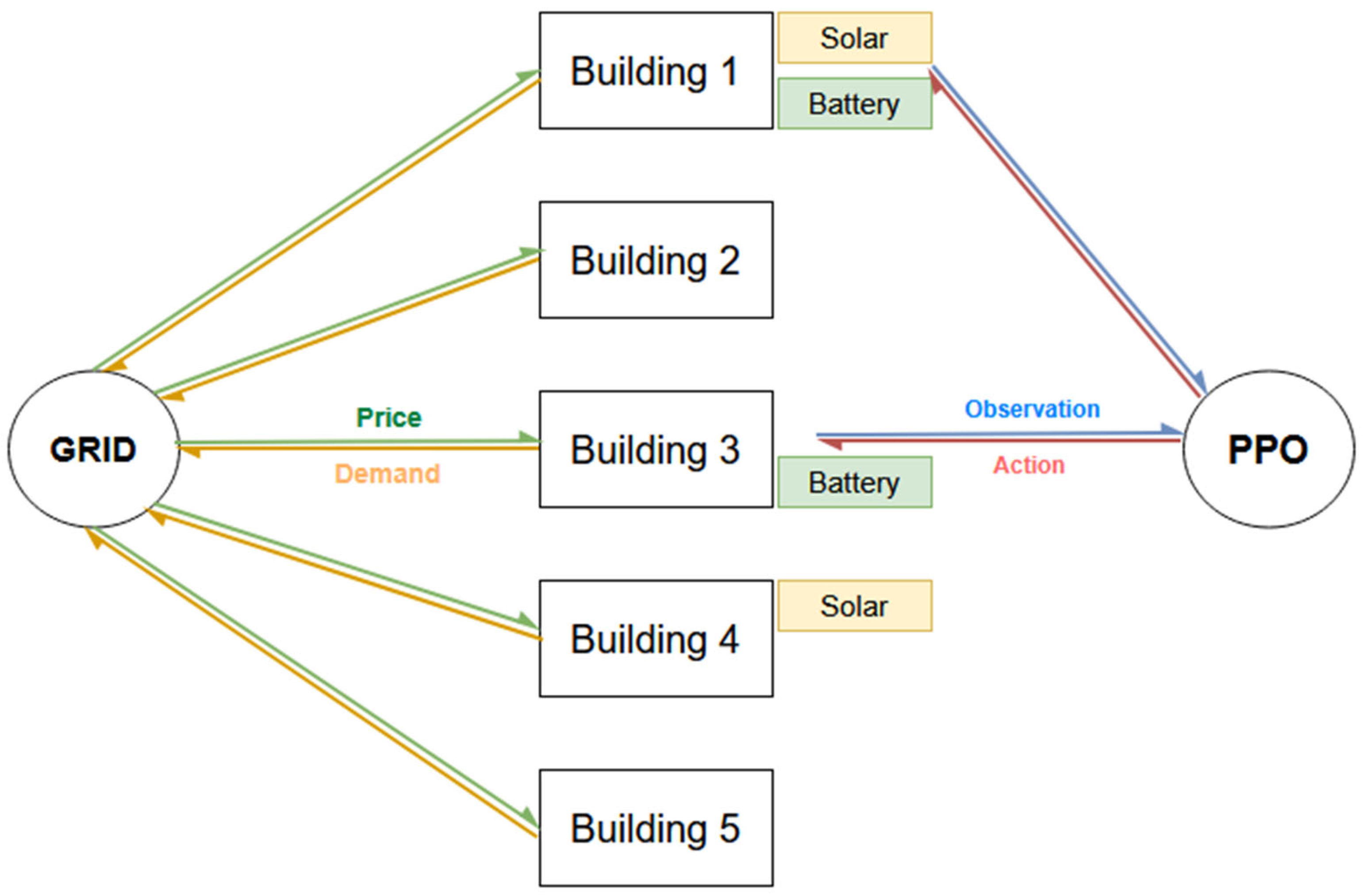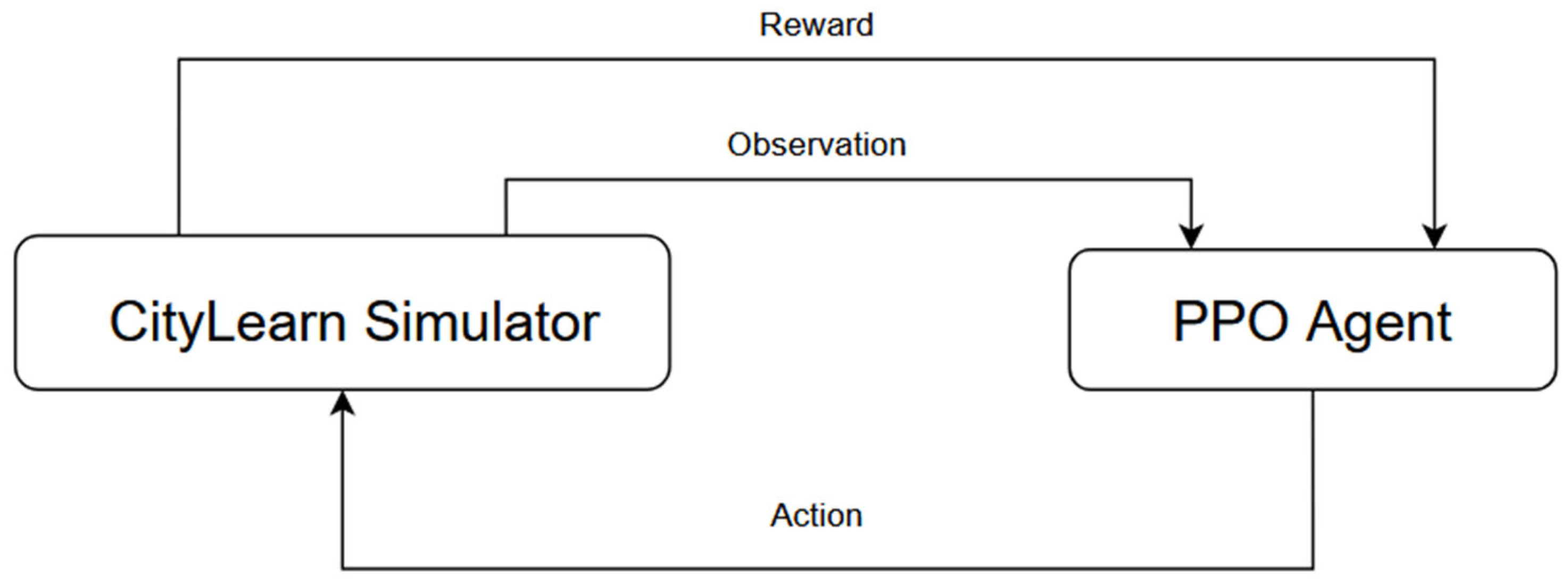 - Nweye, K.; Kaspar, K.; Buscemi, G.; Fonseca, T.; Pinto, G.; Ghose, D.; Nagy, Z. CityLearn v2: Energy-flexible, resilient, occupant-centric, and carbon-aware management of grid-interactive communities. J. Build. Perform. Simul. 2025, 18, 17–38. [Google Scholar] [CrossRef]