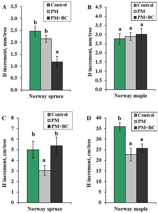 Mean (±SE) stem diameter increment (D increment, mm) of Norway spruce (A) and Norway maple (B) seedlings, and stem height increment (H increment, cm) of Norway spruce (C) and Norway maple (D) seedlings under different treatments (Control—no treatment, PM—exposure to particulate matter on foliage, and PM + BC—exposure to particulate matter on foliage and biochar to substrate). Statistically significant differences among the groups were determined by the Kruskal–Wallis H test and are shown by different letters a and b at p < 0.05.