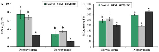 Mean (±SE) concentration of total soluble sugars (TSS, (A)) and malondialdehyde (MDA, (B)) in Norway spruce and Norway maple seedlings under different treatments (Control—no treatment, PM—exposure to particulate matter on foliage, and PM + BC—exposure to particulate matter on foliage and biochar to substrate). Statistically significant differences among the groups were determined by the Kruskal–Wallis H test and are shown by different letters a, b and c at p ≤ 0.05.