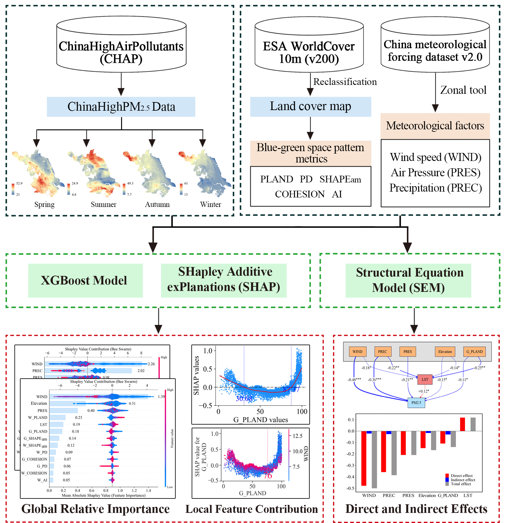 Zhou, W.; Lu, Y.; Yu, Y.; Chen, S. Interactive Mechanisms and Pathways of Meteorology and Blue-Green Space on PM2.5: An Empirical Study Integrating XGBoost-SHAP and SEM. Sustainability 2025, 17, 10698. https://doi.org/10.3390/su172310698