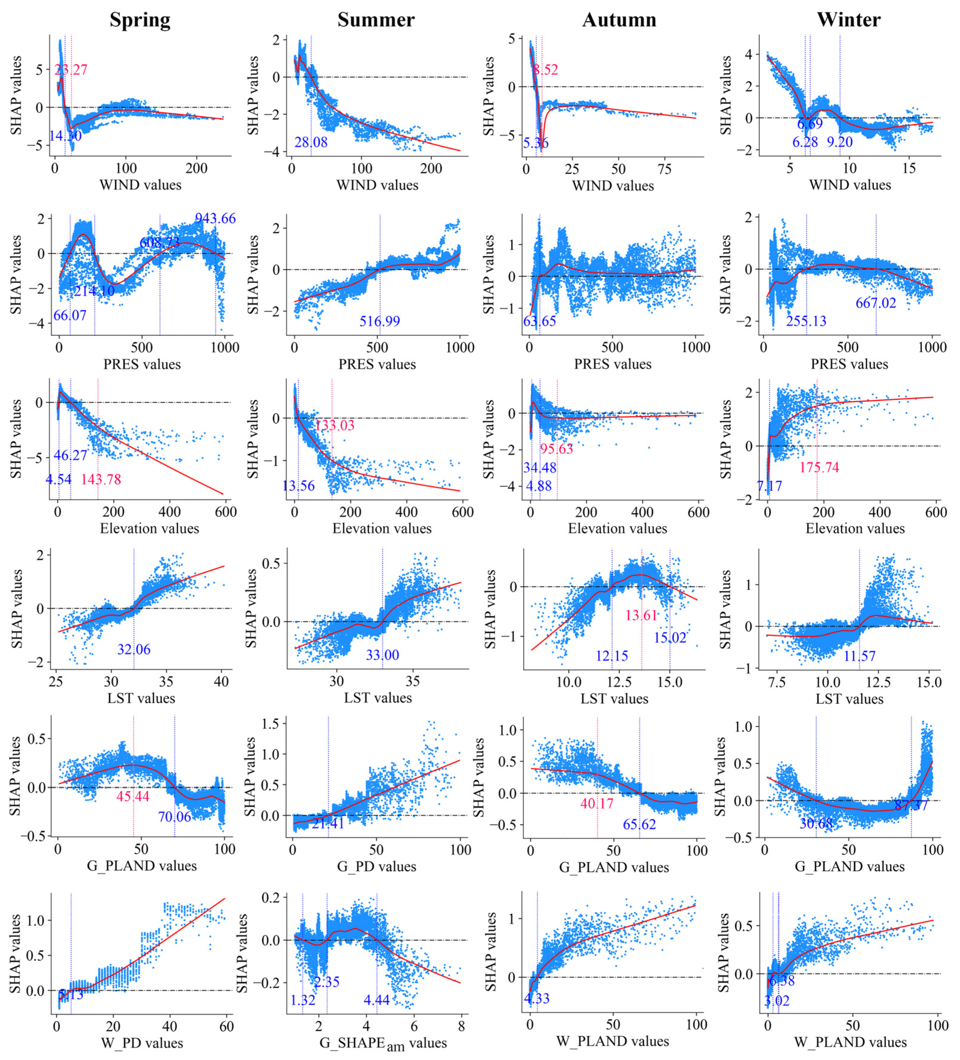 - Cao, W.; Wang, L.; Li, R.; Zhou, W.; Zhang, D. Unveiling the nonlinear relationships and co-mitigation effects of green and blue space landscapes on PM2.5 exposure through explainable machine learning. Sustain. Cities Soc. 2025, 122, 106234. [Google Scholar] [CrossRef]
