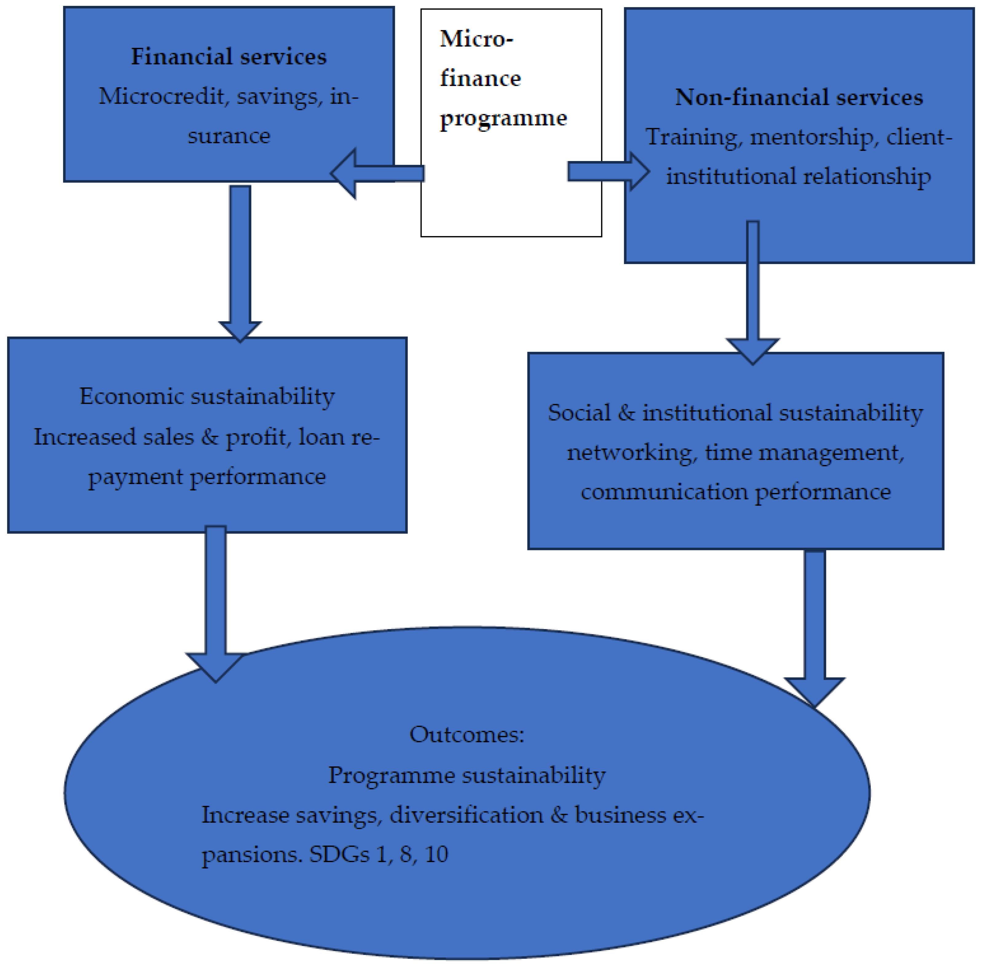 14] show that programmes integrating financial and training services achieve repayment rates of 10 to 20% higher than those offering credit alone. This aligns with participants’ perceptions in the present study. The study revealed that the interconnectedness of financial and non-financial services influences programme success: loan design without individual assistance is unstable, and training without proper loan arrangements is unproductive. The findings are believed to have provided both theoretical insight and practical guidance for designing holistic, client-responsive microfinance models in underserved communities. The findings of this study reveal that the combination of financial and non-financial services enhances loan repayment and the long-term viability of microfinance programmes. This relationship extends beyond institutional performance, as it supports the social and economic sustainability of rural livelihoods. Improved repayment rates and programme continuity contribute to community resilience, job creation, and poverty reduction. In this sense, microfinance sustainability represents an important pathway for achieving inclusive development in disadvantaged regions. By strengthening entrepreneurial capacity and building trust between clients and financial institutions, microfinance programmes foster sustainable income generation and align with the broader sustainable development agenda.