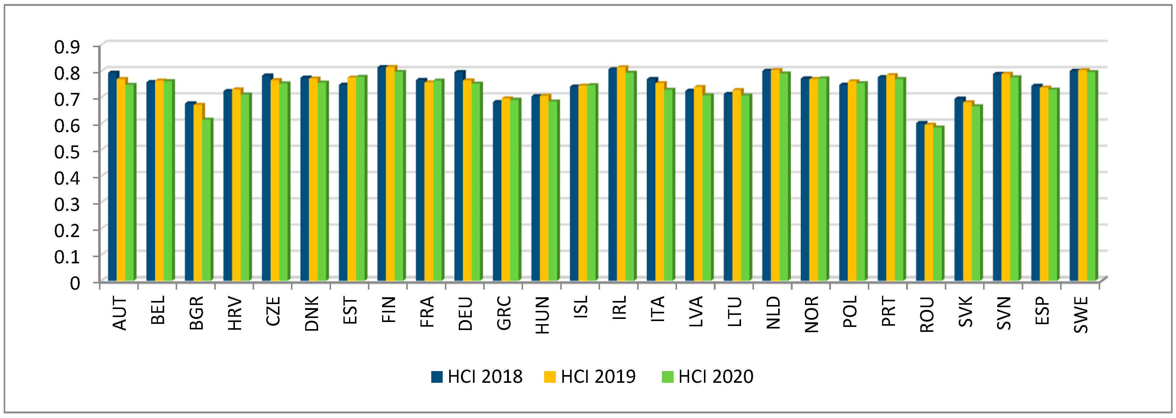 Based on the HCIe index, for which the reference range is [0;1], a hierarchical classification of the 26 European countries under study was created. The countries were then grouped into five classes according to their HCIe index level. Equally spaced intervals were adopted, where class 1 represented countries with the highest level of the HCIe index and class 5 represented countries with the lowest level (