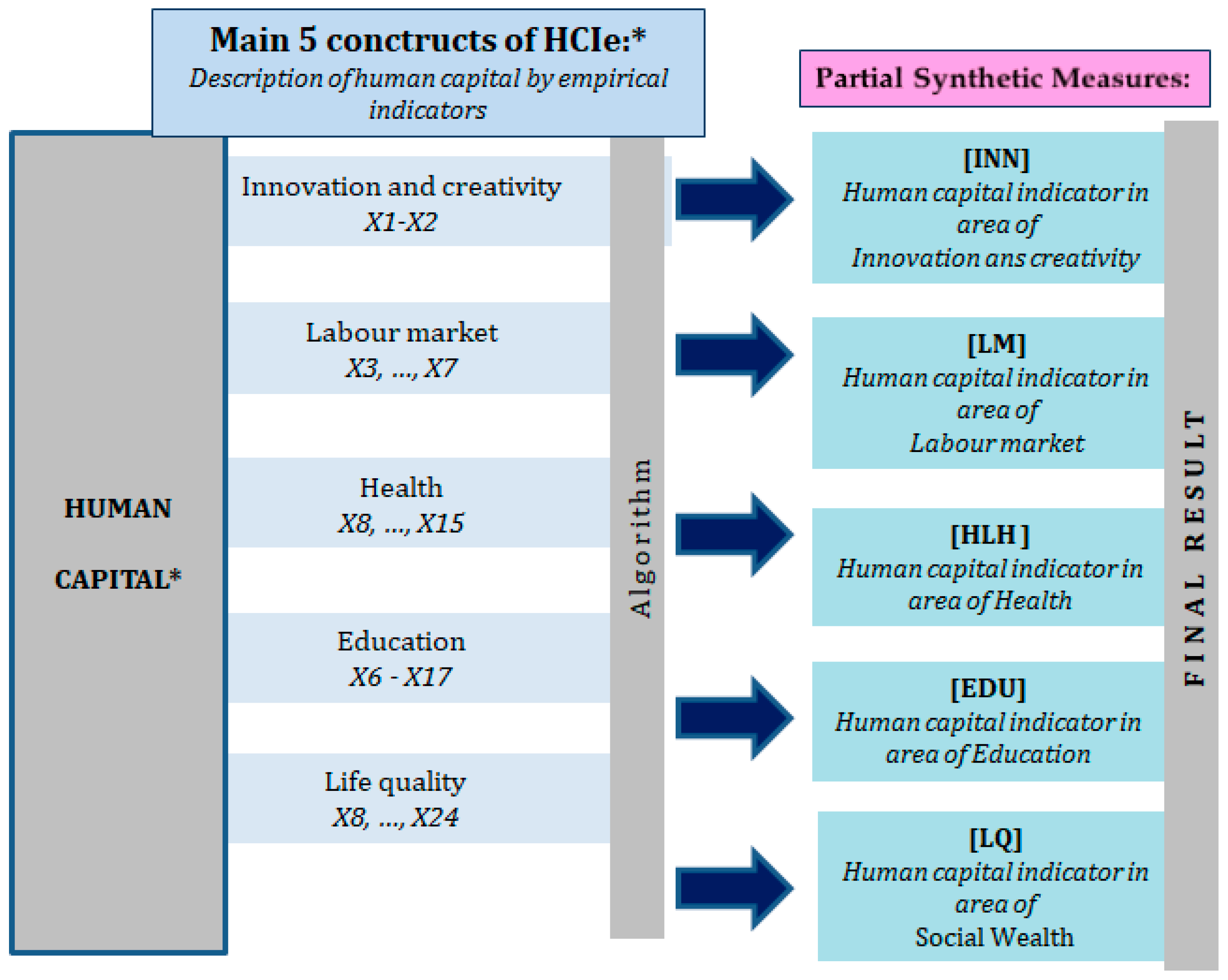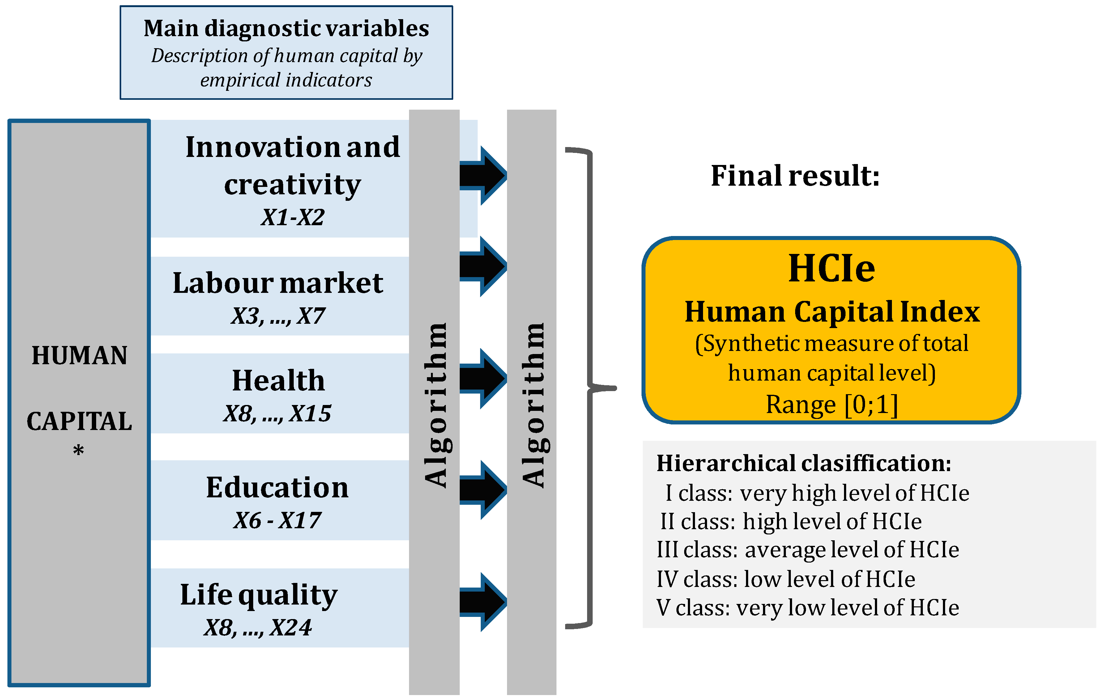 9]. Therefore, the developed HCIe human capital measure is assumed to reflect not only formal education, but also the overall efficiency and potential of the labour market, including health indicators. These indicators are fundamental to determining the effectiveness and sustainability of human capital.