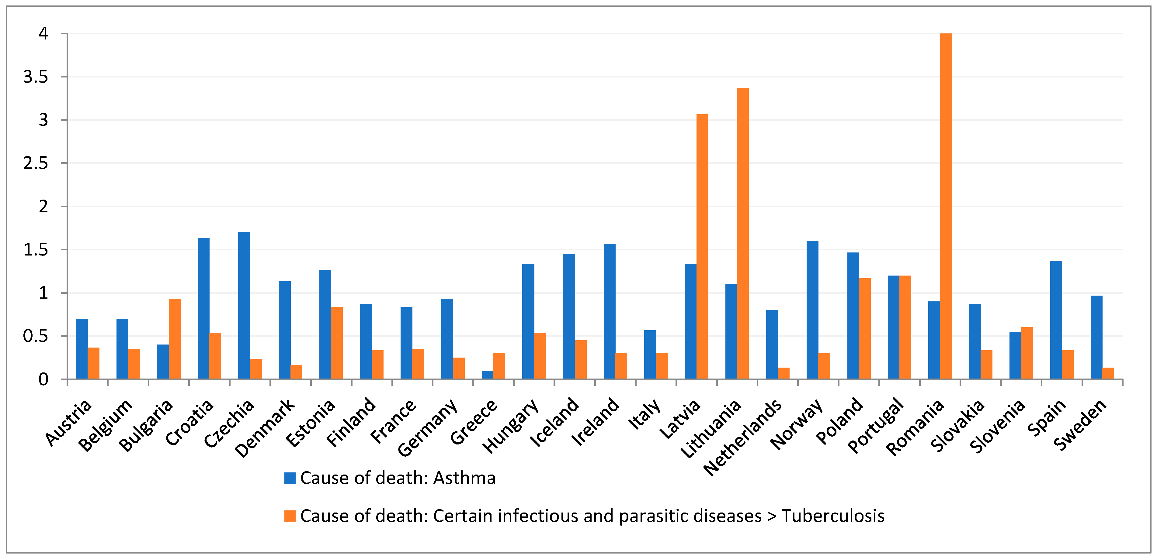 Poland and Ireland have particularly unfavourable indicators for mortality due to asthma (1.46 and 1.56, respectively, median 1.03), as well as for chronic obstructive pulmonary diseases, with Poland’s indicator (41.3) being one of the highest in the entire analysed group of 26 countries (median 22.9).