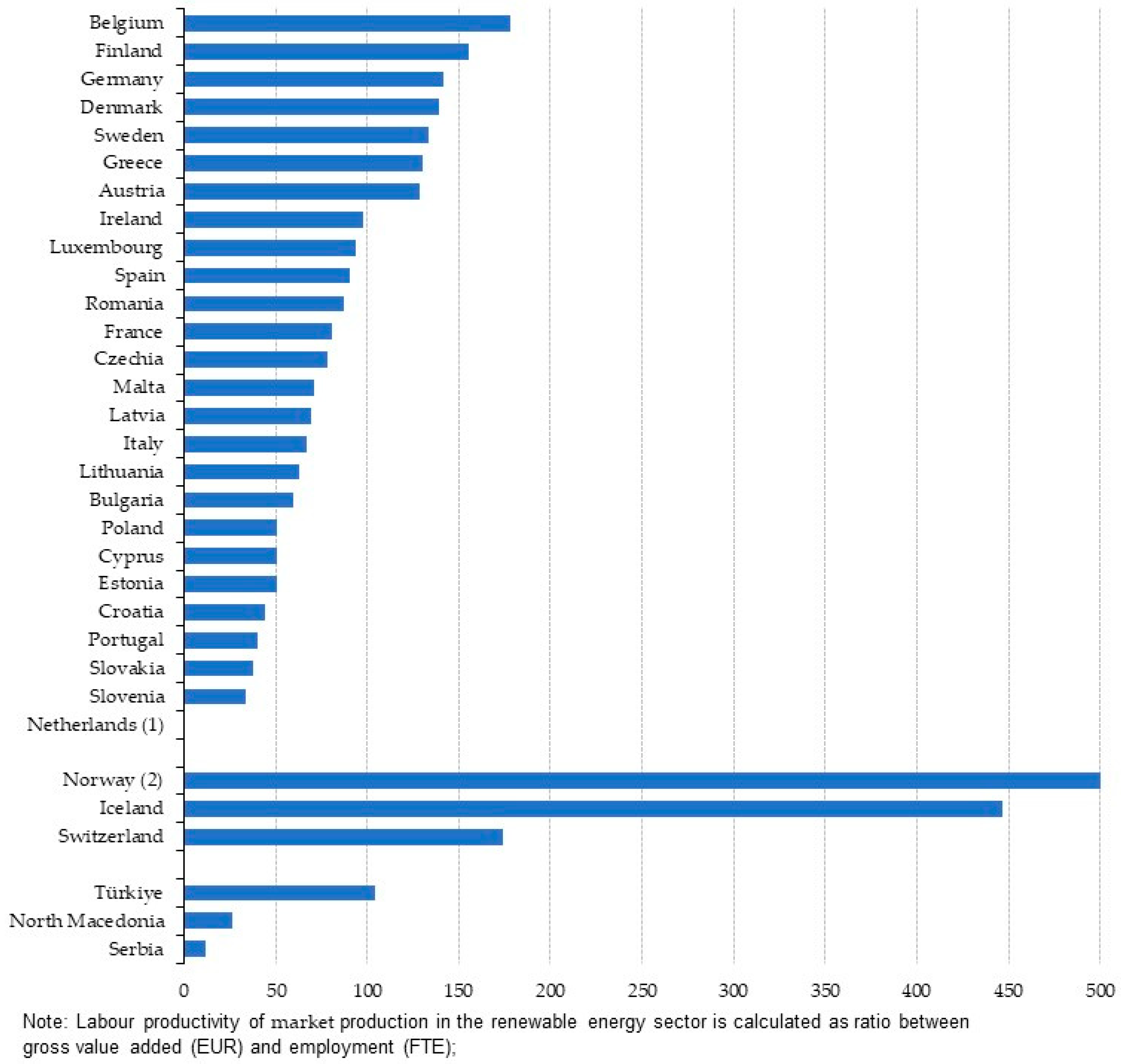 Figure 13). High labour productivity means that the sector is more competitive and generates more added value per employee. This allows for comparison of labour productivity in the renewable energy sector with labour productivity in other energy sectors (e.g., the fossil fuel sector) or in the entire economy. An increase in labour productivity in the renewable energy sector may indicate technological progress and innovation, enabling the production of more energy with fewer workers. Changes in labour productivity can affect employment in the renewable energy sector. Increases in productivity could lead to more energy being produced with fewer workers, but they could also stimulate growth in the sector and job creation in other areas (e.g., research and development, equipment manufacturing).