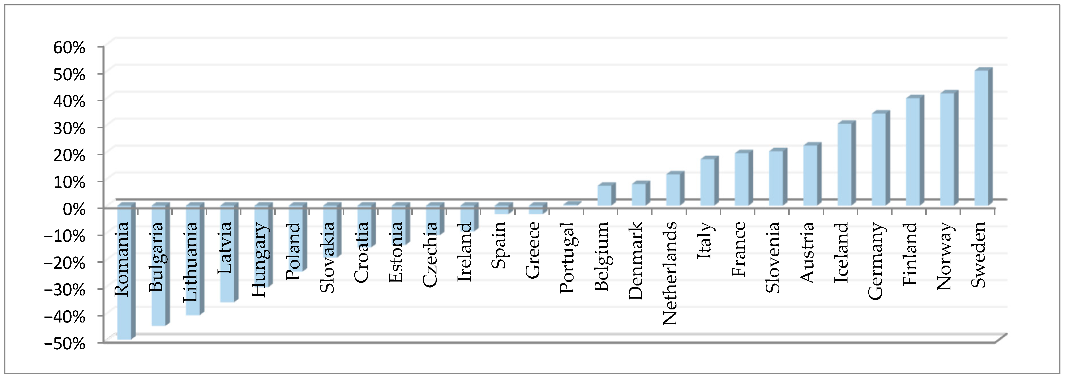 Additionally, to improve the interpretative value of the results, the data were presented in relative terms, i.e., in relation to the average [HCIe] index value calculated for all 26 countries. Detailed data on the hierarchical classification of countries and their distance from the average [HCIe] index value (in percentage terms) are presented in