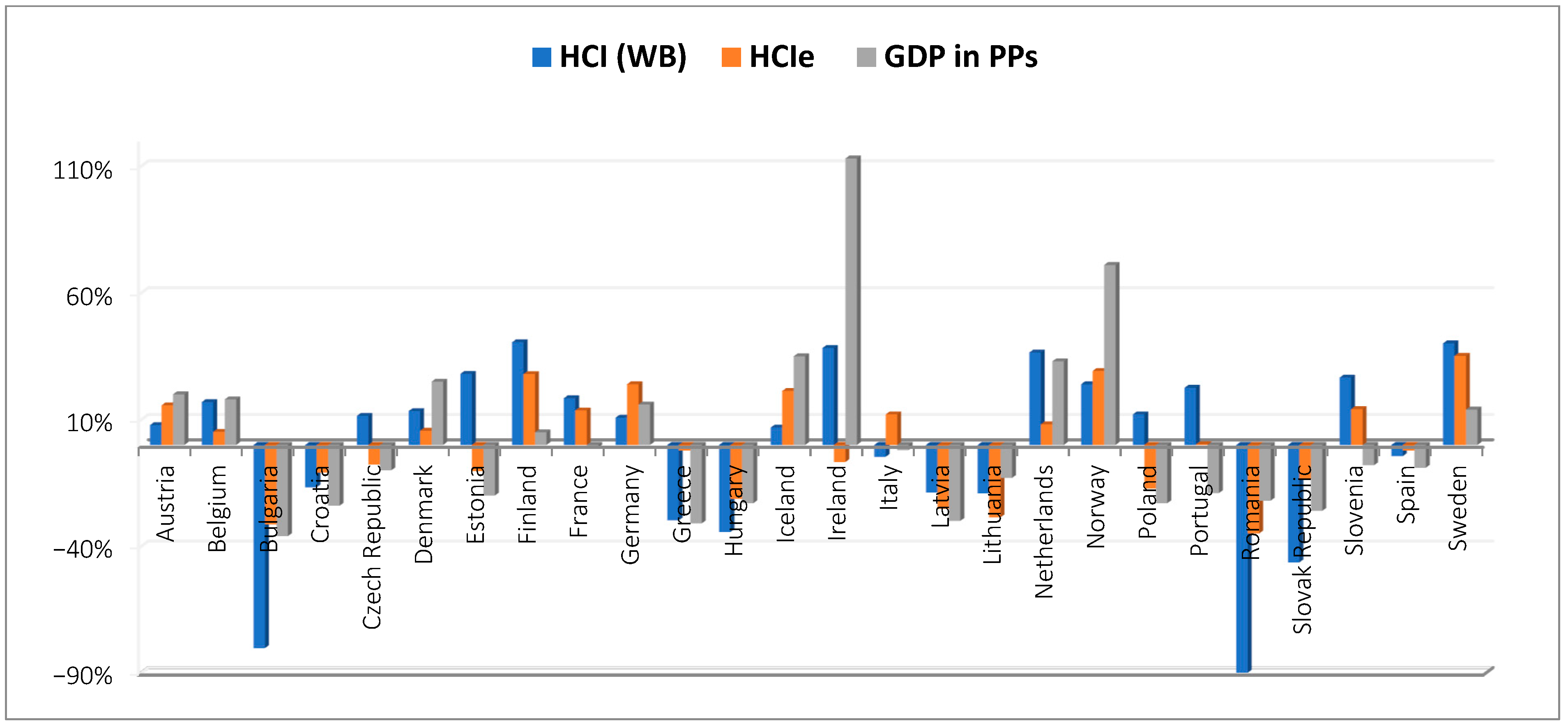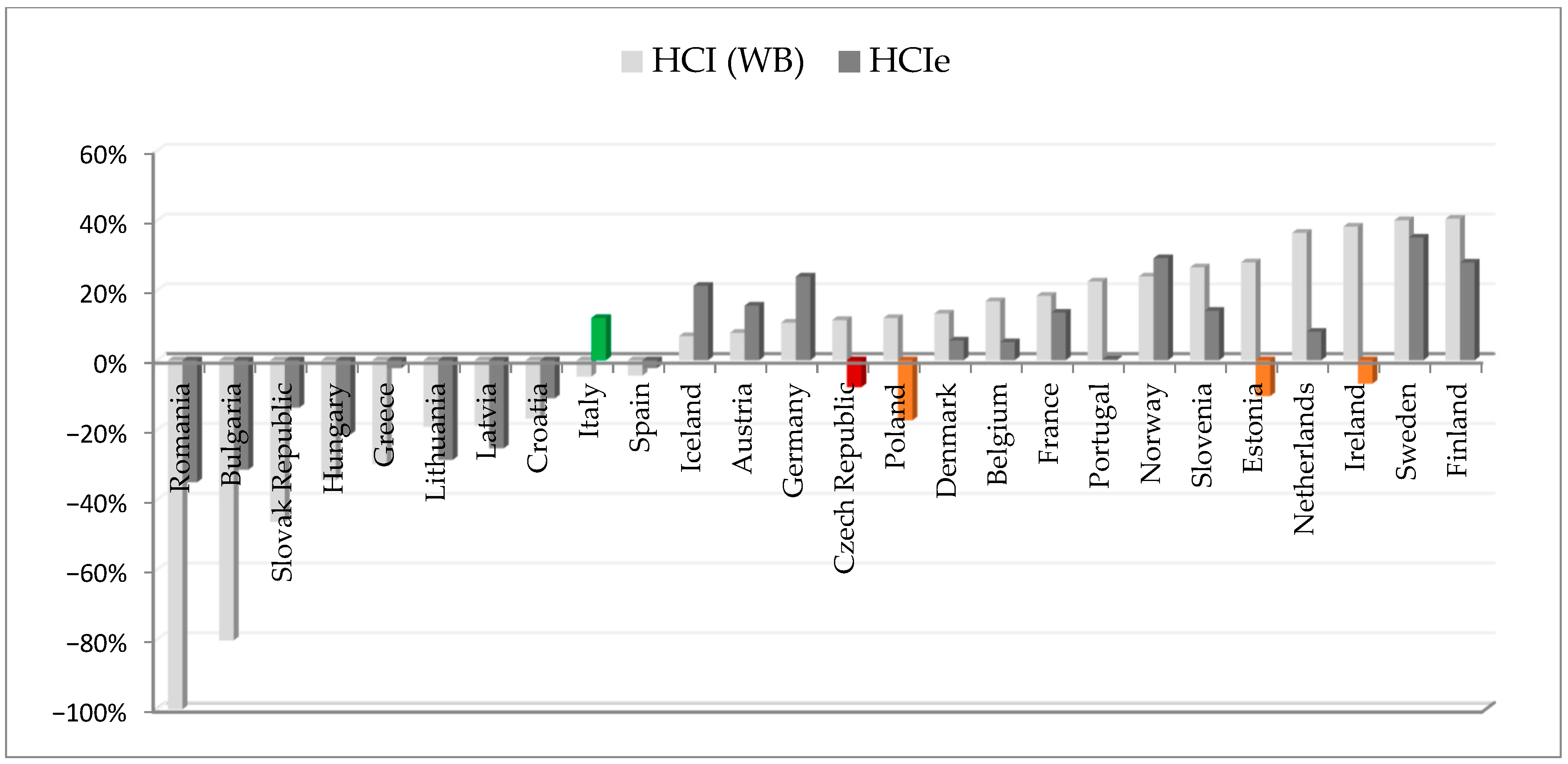 Figure 15). The scale of the differences between countries can be observed using a relative approach. For example, the average HCIe value for the 26 countries studied is 0.473, which can be used as the “zero” level. A negative value indicates that a given country’s HCIe score is lower than the group average, while a positive value indicates the opposite. This presentation of the data illustrates the scale of the disparity more clearly than simply using the estimated HCIe value.