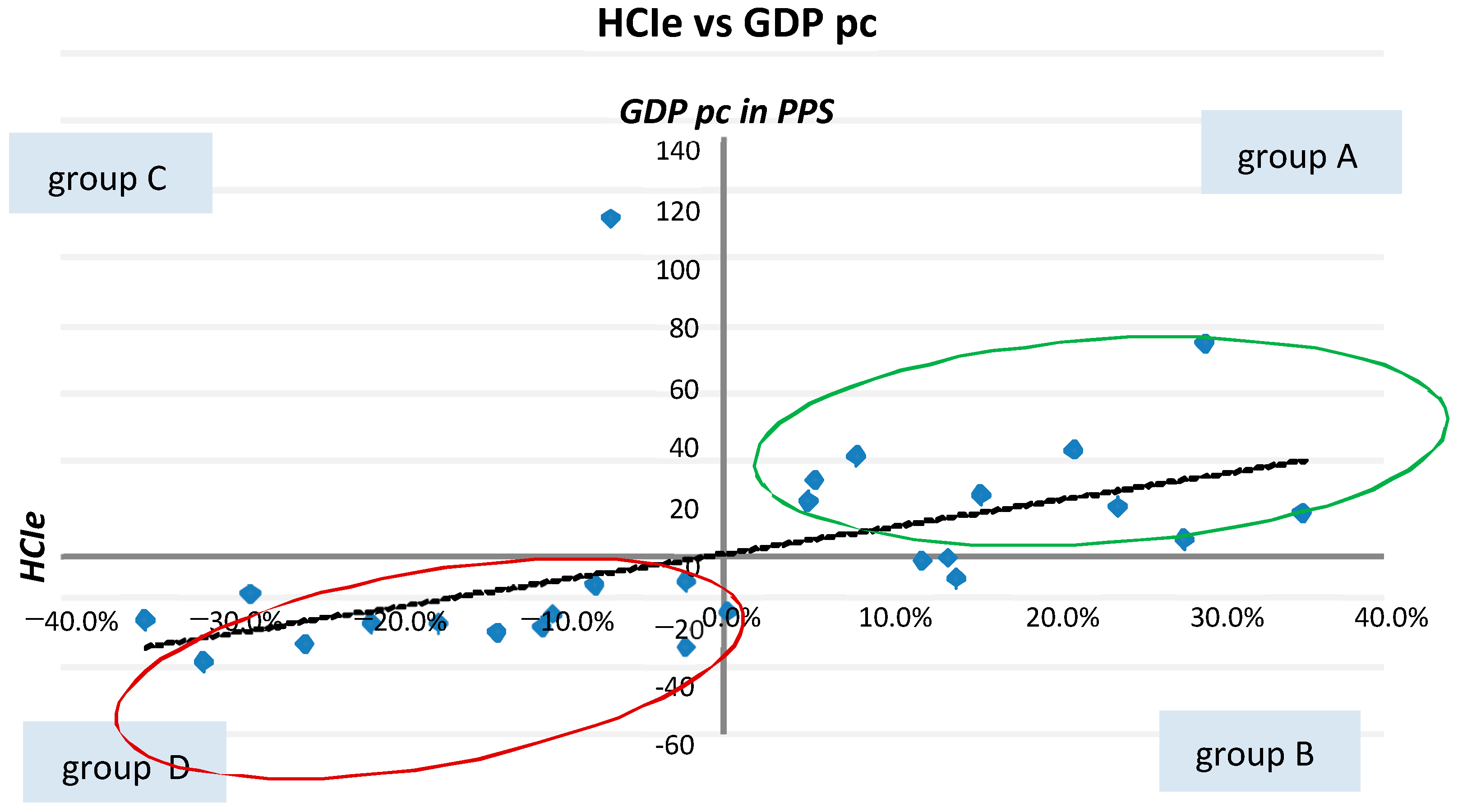 A similar attempt was made to group countries in relation to the measure of well-being, which is GDP per capita (pc) expressed in purchasing power standards (PPS) (EU 100%). As a result of the grouping procedure, two groups of countries were obtained that differ in the characteristics of the analysed variables and are arranged along the conventional East–West line of Europe: group A and group D. Only a few countries were found in group B, with just one in group C. The detailed results of the analysis are presented graphically in
