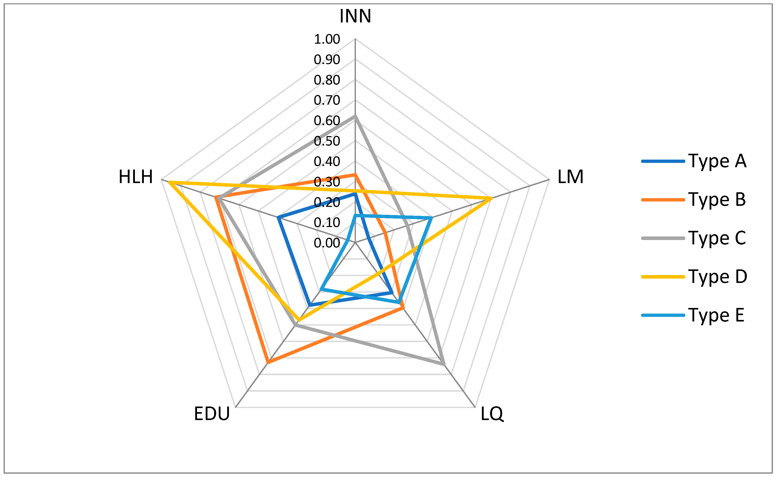 Classifying countries according to characteristic types (A–E) reflects the actual differences in human capital levels and characteristics observed between these groups. It also assesses the degree of differentiation within individual groups (types A–E), as illustrated graphically in
