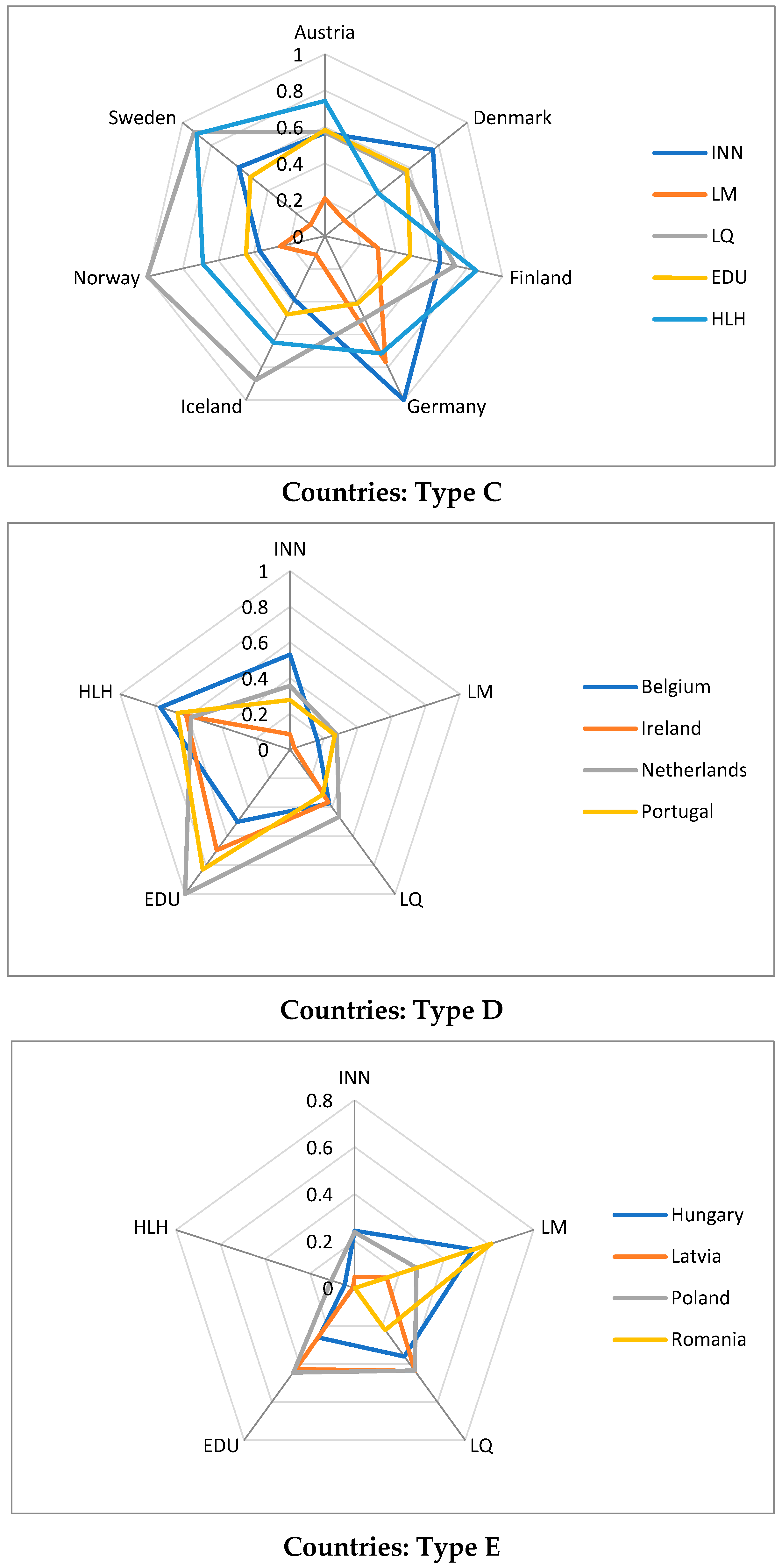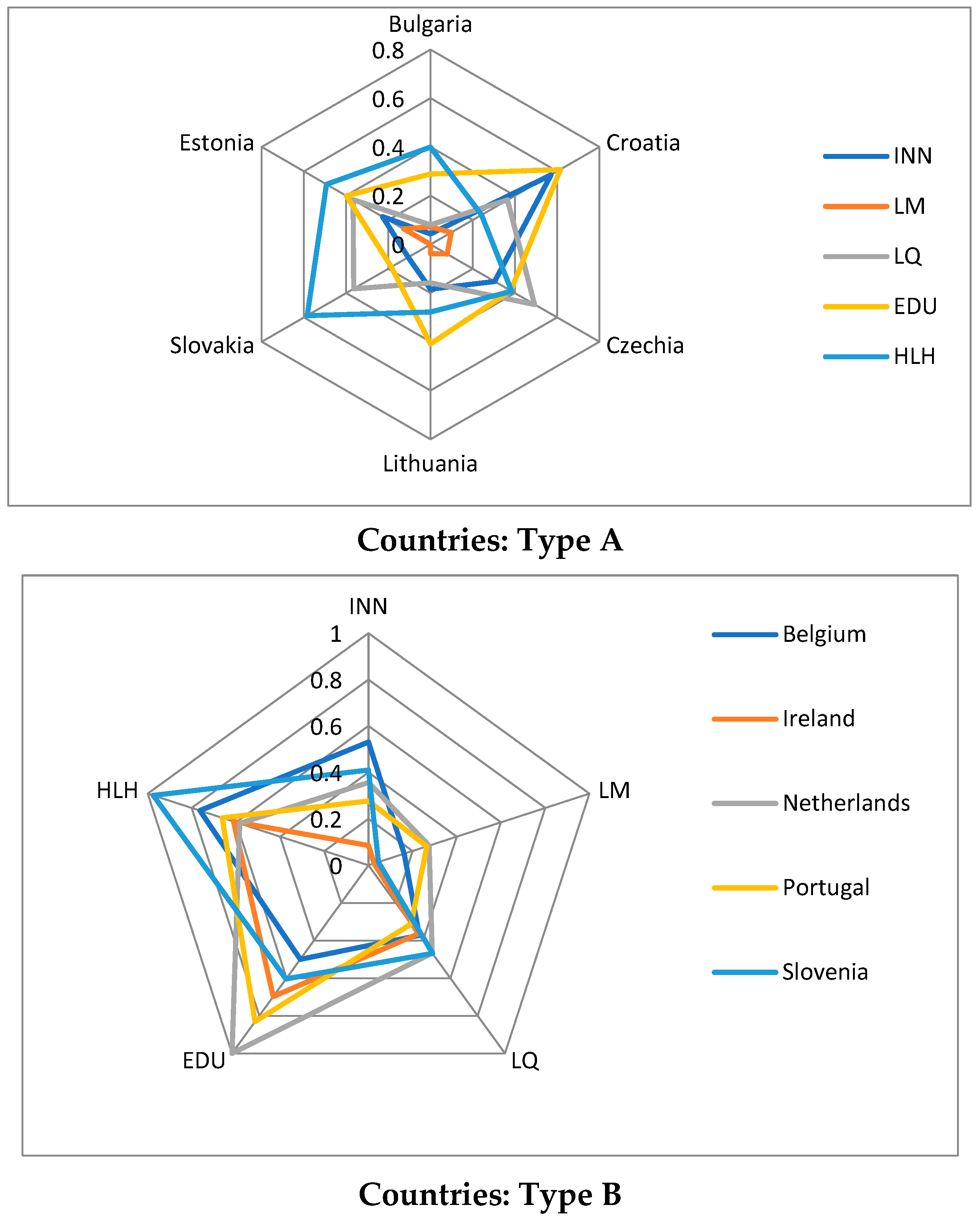 Type C and Type D countries, on the other hand, are characterised by an opposite position on the North–South line. While southern European countries fare relatively well in terms of health, their quality of life assessment is very low. However, these two types of countries are united by a relatively favourable assessment in the area of education. Type B and Type C countries can be described as intermediate; however, they can also be considered completely different due to their varying levels of partial indicators for individual components (HCIe). What distinguishes Type B countries, albeit negatively, is their low labour market resource assessment. Type C countries did not receive any extreme assessments and were the only typological group to receive a favourable innovation assessment.