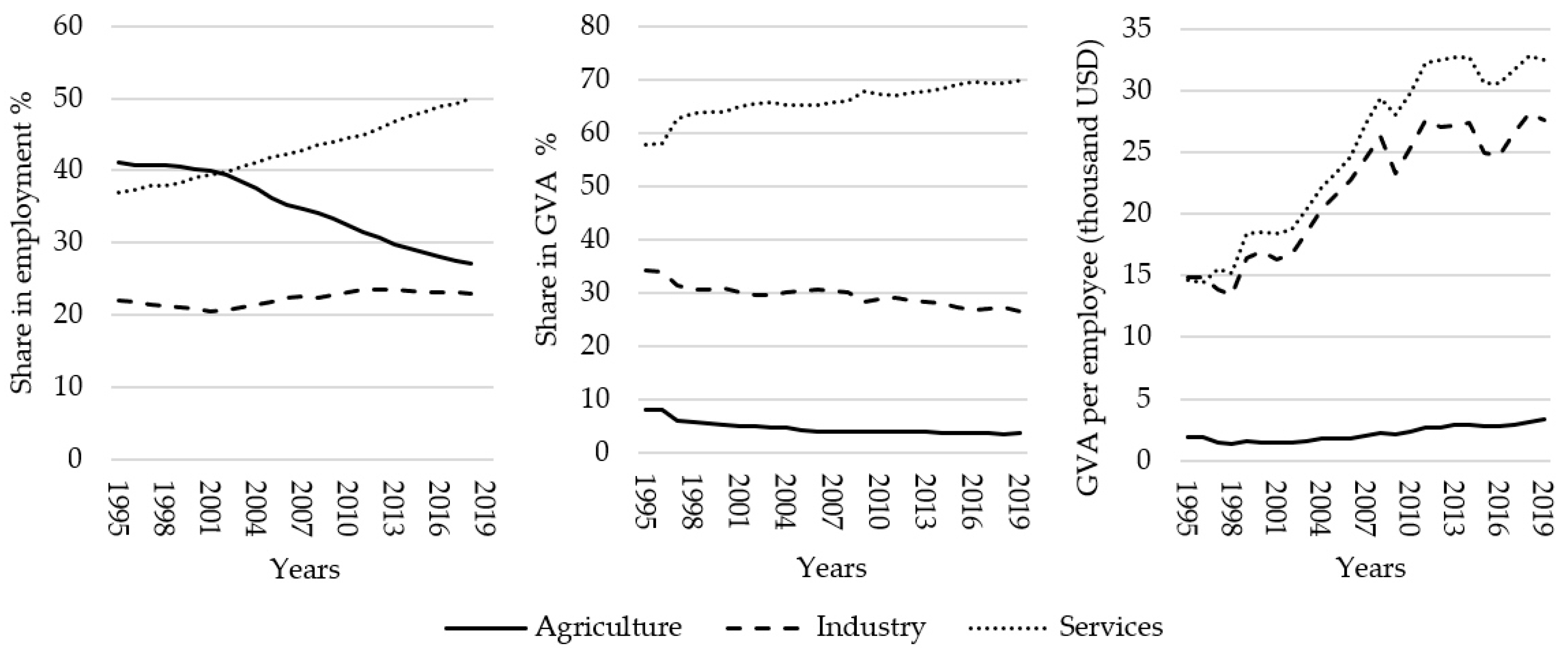 According to the three-sector theory, the national economy can be divided into the agricultural, industrial, and service sectors. With economic development and progress, the importance of agriculture and its share in gross value added (GVA) are declining, first in favour of industry and then services [8,9,10,11,12,13]. Even with a fairly rapid decline in the share of agriculture in the employment structure, the different rates of change in the share of individual sectors in the GVA structure mean that inter-sectoral differences in labour productivity measured by GVA per employee are widening over time to the detriment of the weakest sector, i.e., agriculture (Figure 1). As a result, the income disparity between the agricultural population and the non-agricultural population is also increasing [7,14,15].