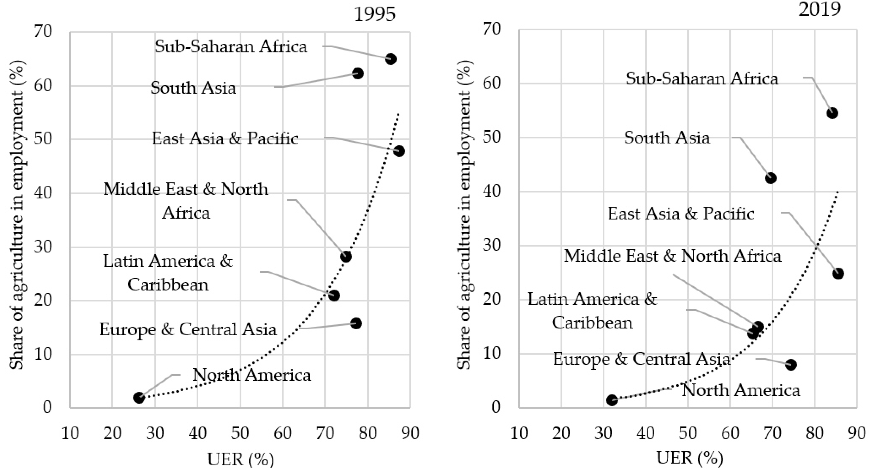 Figure 2. Share of agriculture in employment and unproductive employment rate (UER) in selected regions identified according to the World Bank classification in 1995 and 2019. Source: Own study based on World Bank data [16].