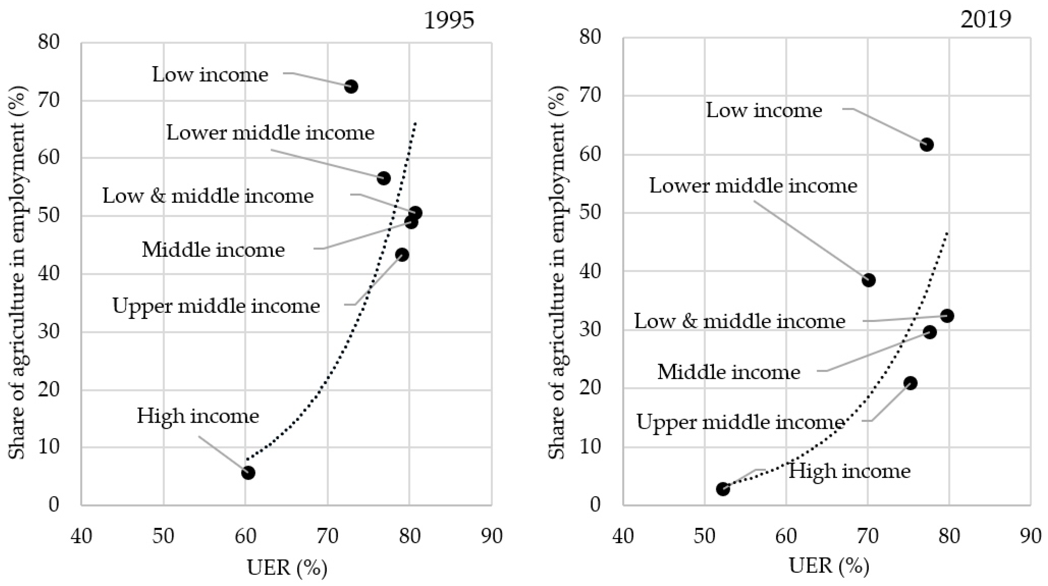 Figure 3. Share of agriculture in employment and unproductive employment rate (UER) in groups of countries distinguished by income level in 1995 and 2019. Source: Own study based on World Bank data [16].