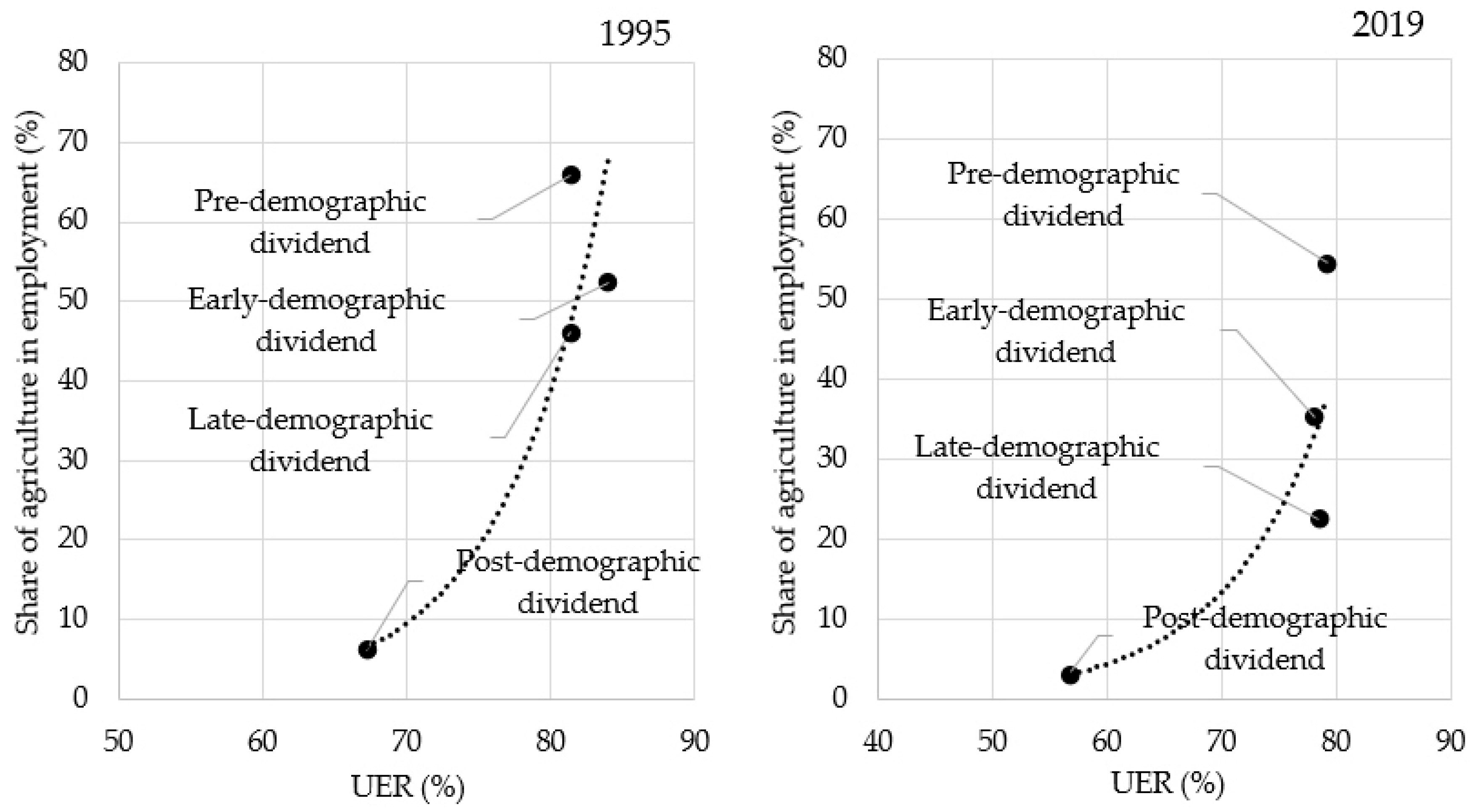 Figure 4. Share of agriculture in employment and unproductive employment rate (UER) in groups of countries at various stages of the demographic dividend in 1995 and 2019. Source: Own study based on World Bank data [16].