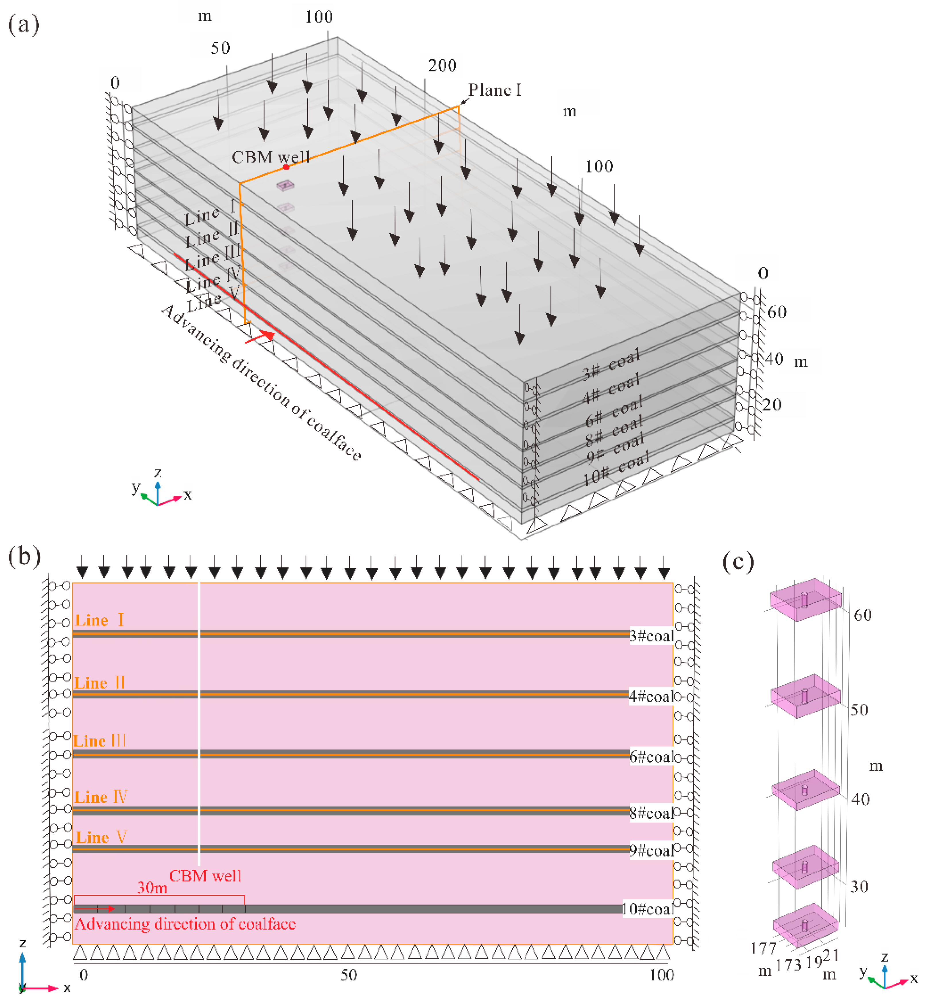 - Liu, Z.; Cheng, Y.; Liu, Q.; Jiang, J.; Li, W.; Zhang, K. Numerical assessment of CMM drainage in the remote unloaded coal body: Insights of geostress-relief gas migration and coal permeability. Nat. Resour. Res. 2017, 45, 487–501. [Google Scholar] [CrossRef]