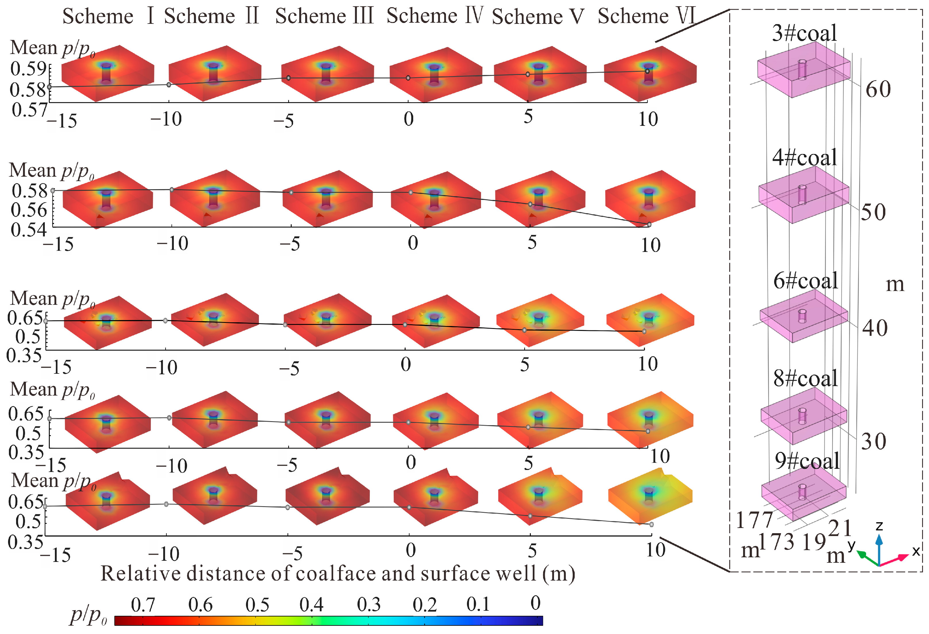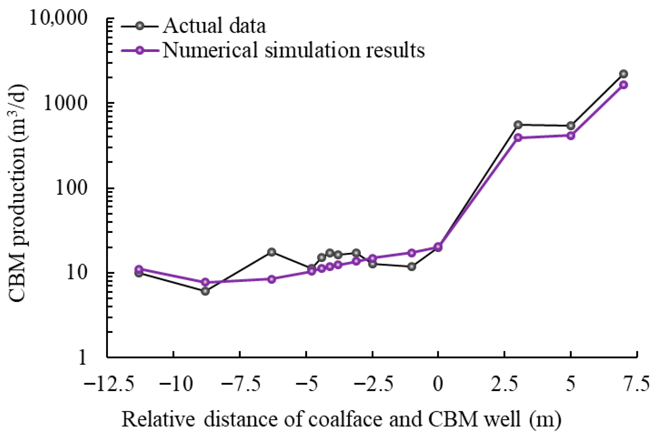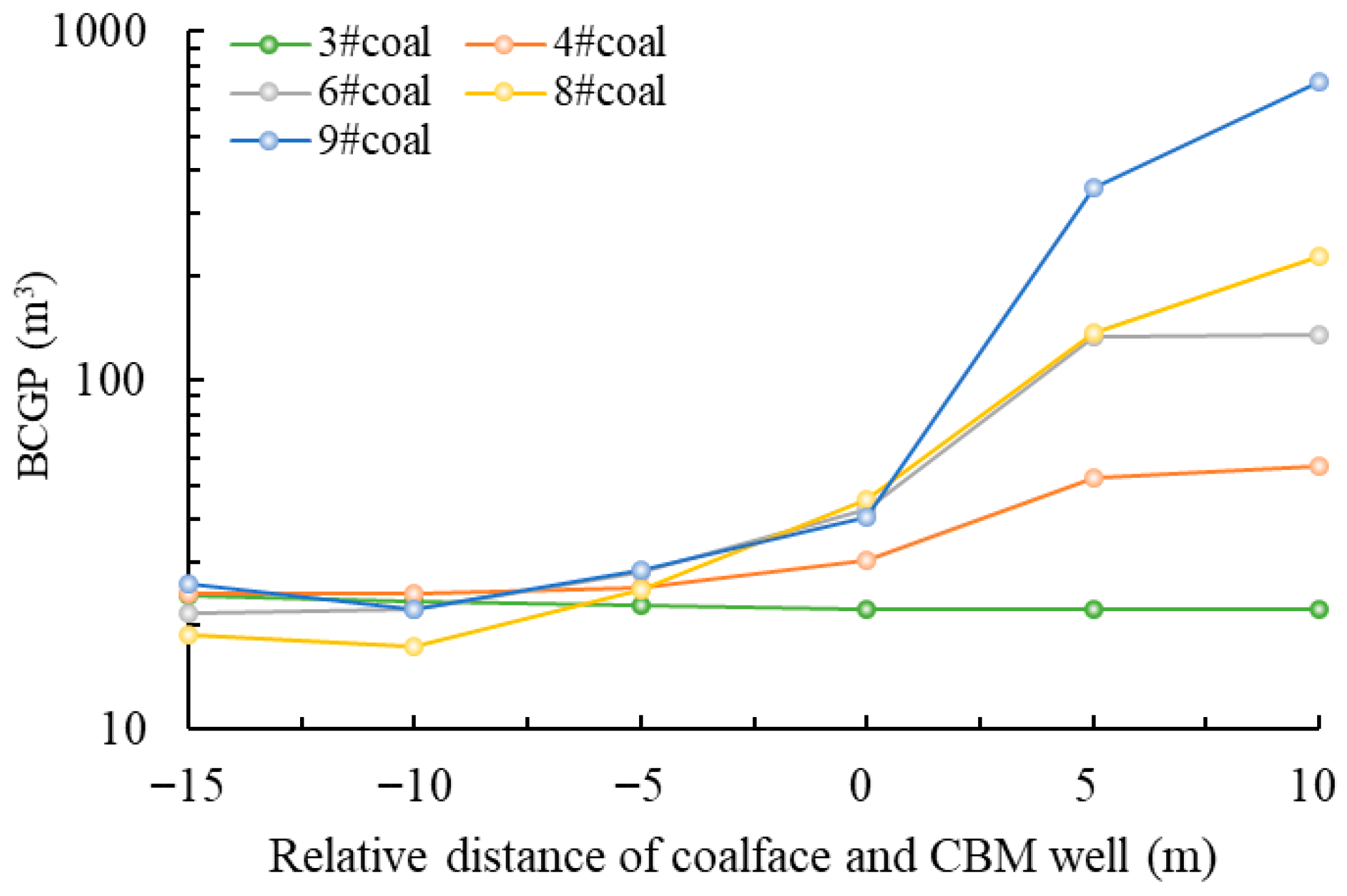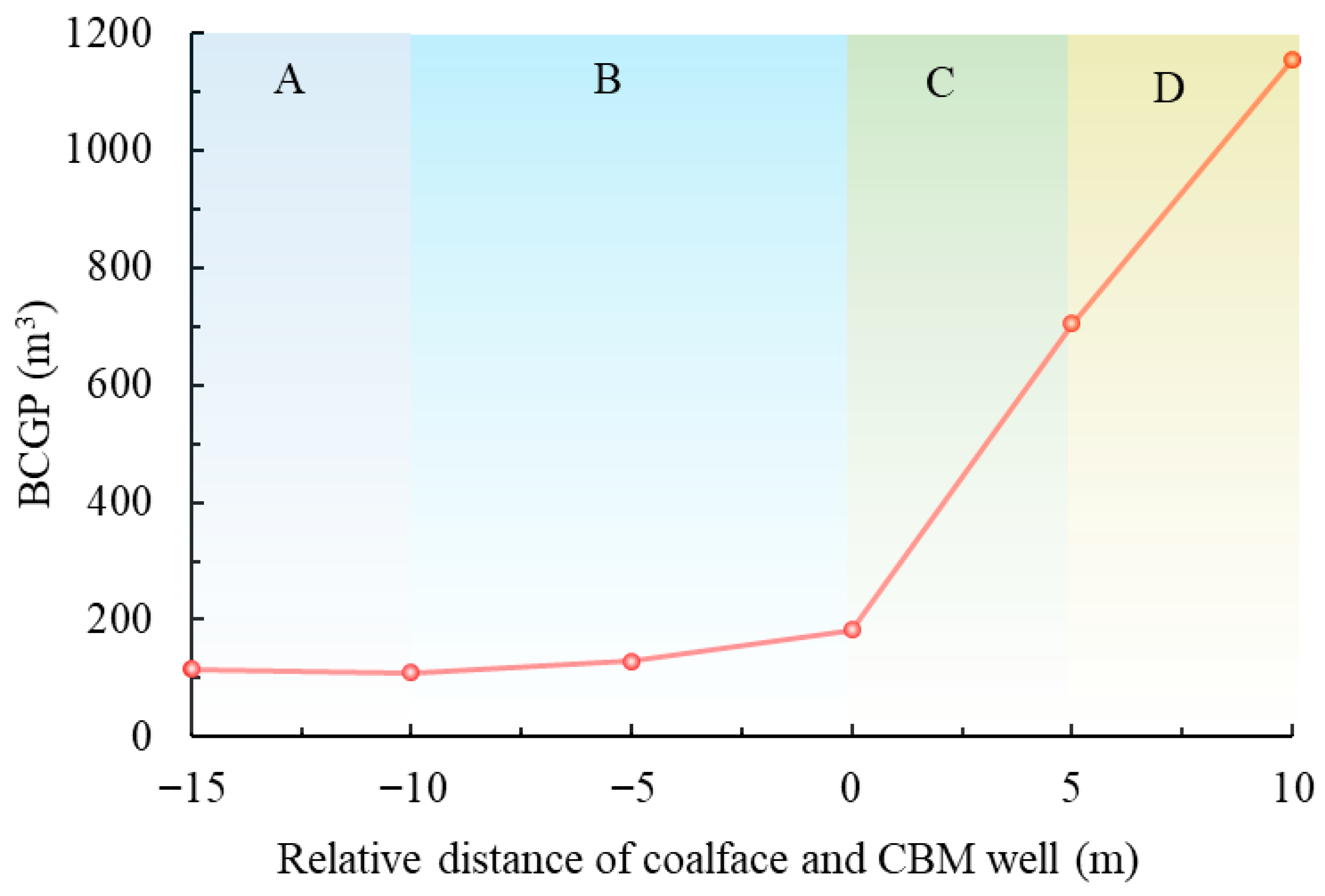 - Under the influence of permeability and the gas pressure gradient, the BCGP of the CBM well undergoes four types of variation: gradual decrease, slow rebound, rapid increase, and further surge. The onset of the rapid increase stage defines the optimal start-extraction time, which in the study area coincides with the coalface reaching the well location.