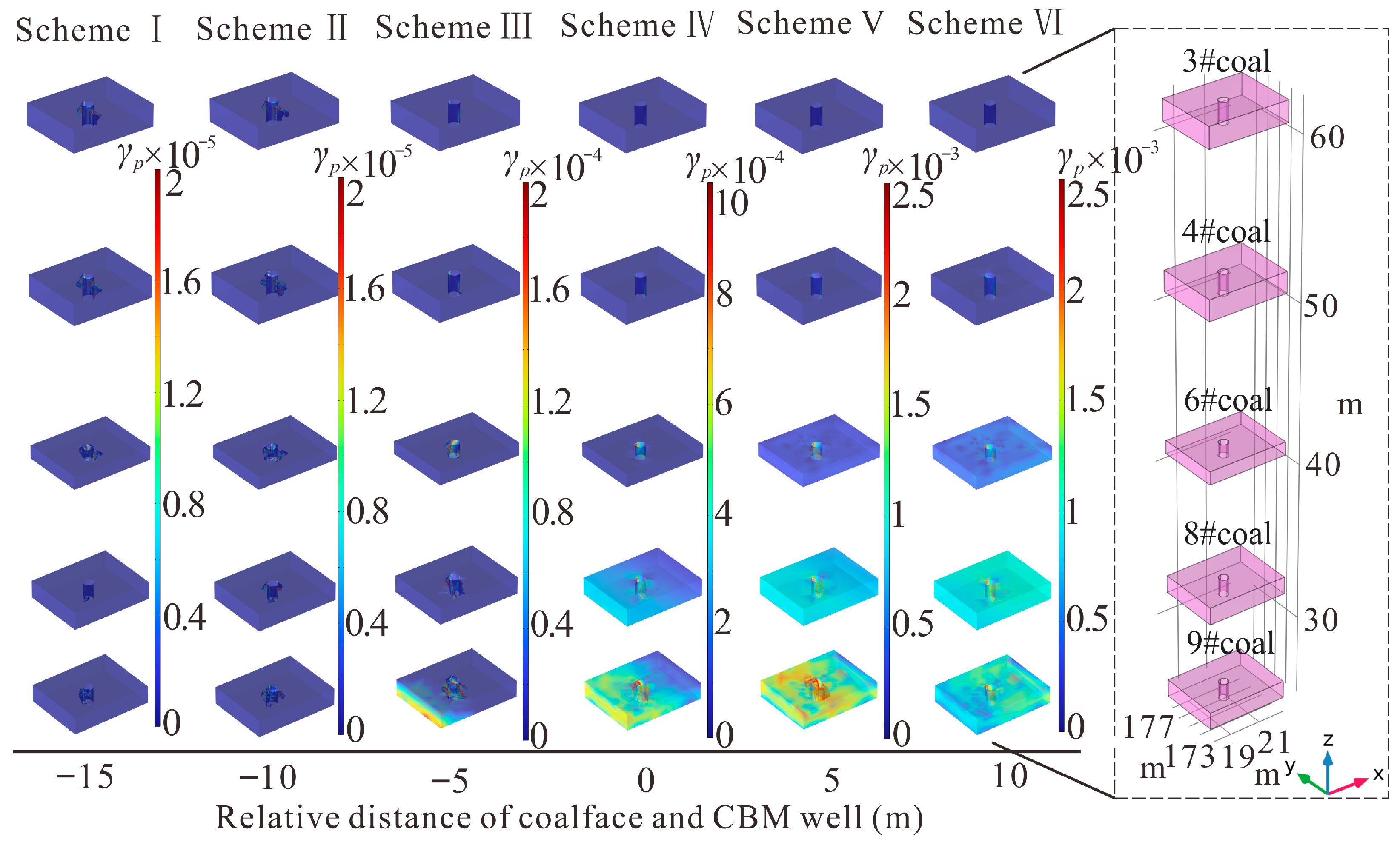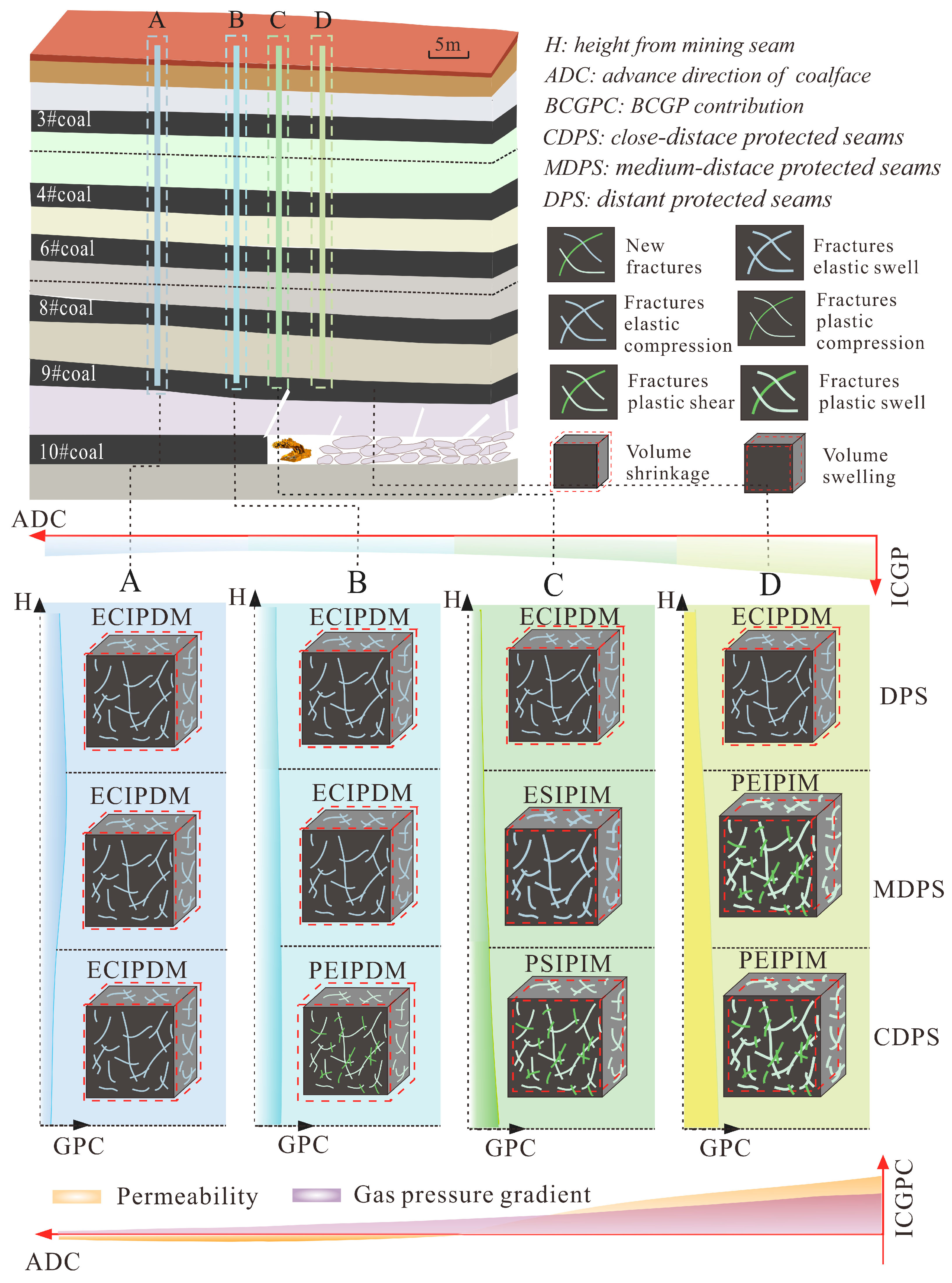 - In mining areas, protected seams exhibit five permeability models under the combined influence of stress and strain. Distant protected seams develop only in the ECIPDM. Medium-distance protected seams successively exhibit the ECIPIM, ESIPDM, and PEIPIM. Close-distance protected seams evolve through the ECIPDM, PCIPDM, PSIPIM, and PEIPIM, with the latter two models primarily enhancing coal seam permeability and CBM production.