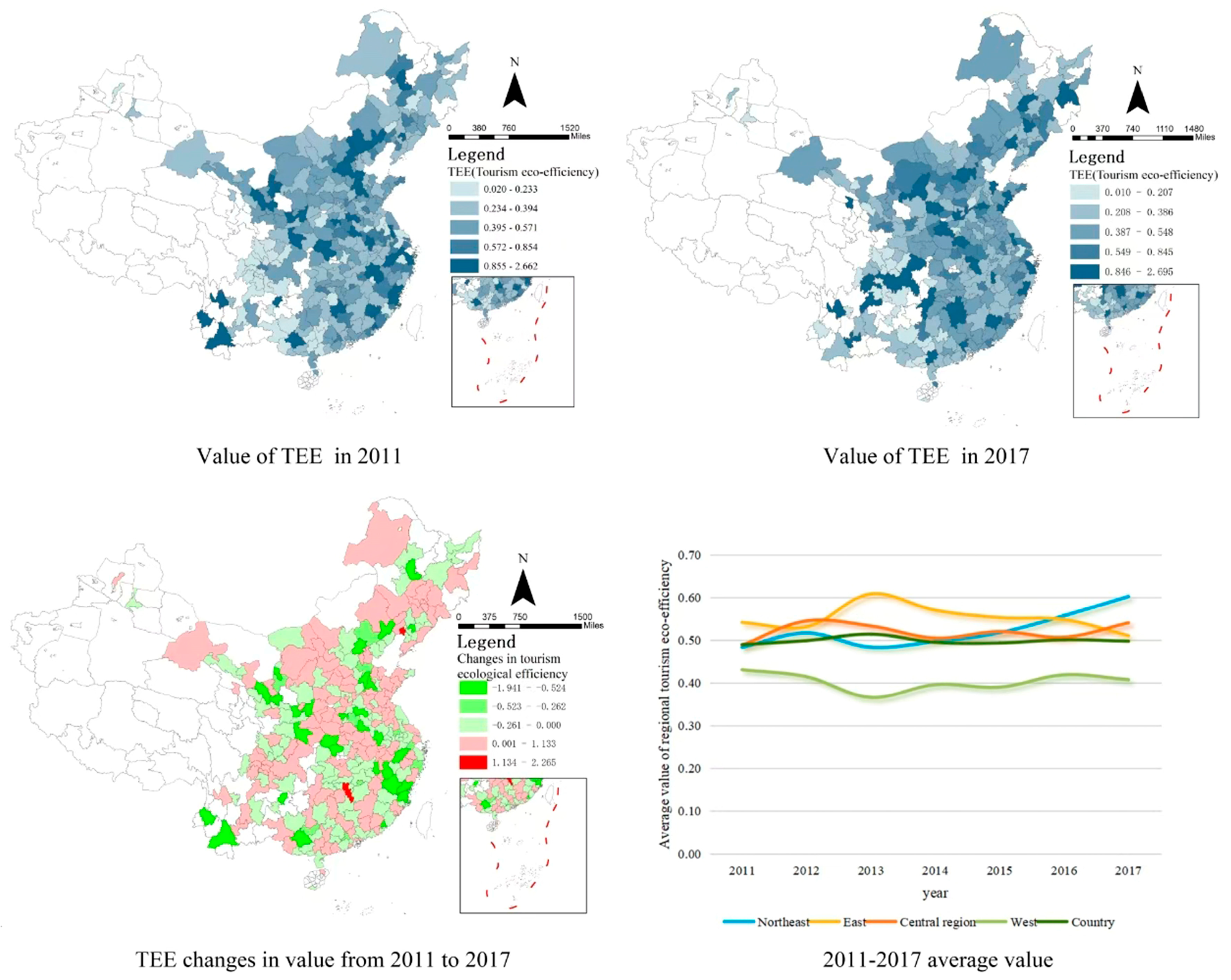 It shows that TEE in China remained at around 0.5. China’s TEE generally fluctuated slightly. The TEE value peaked in 2013 (0.51) and was at its lowest point in 2011 (0.49). It demonstrates that environmental benefits can still be greatly enhanced. In the process of expansion, China’s tourism sector must further strike a balance between economic and environmental advantages. In 2011, the western provinces of Shaanxi, Yunnan, and Guangxi, as well as coastal cities in the eastern area and cities along the Yellow River Basin, contained the majority of the cities with better tourism eco-efficiency. The three northeastern cities along the Yangtze River’s middle and upper reaches, and a few coastal cities in the east are the main locations of high-efficiency cities in 2017. In the 2011–2017 period, 45.8% of the cities showed an increase in tourism eco-efficiency compared to 2011, 14.2% of the cities had a significant decline, while the remaining 39.3% of the cities had a slight decline. In general, China’s urban tourism is becoming more environmentally friendly.