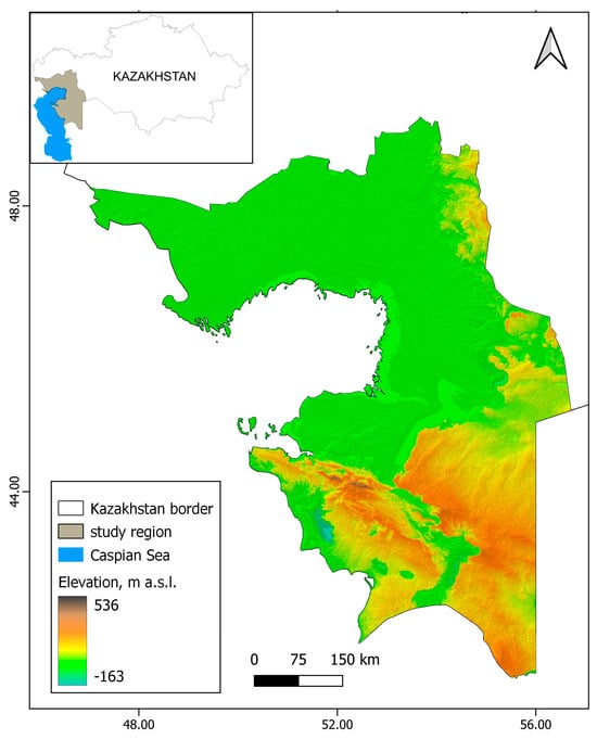The study area encompasses the western regions of Kazakhstan—the Atyrau and Mangystau provinces (Figure 1), which are characterised by extremely arid climatic conditions and high vulnerability to climate-driven degradation processes []. The Atyrau region lies within the Caspian Depression and is distinguished by its predominantly flat topography, comprising alluvial-deltaic plains of the Ural River basin. The geological structure consists of alternating marine and continental sediments, which contribute to the formation of saline and sodic soils. The soil cover is represented mainly by Gypsisol, calcic, sodic and Solonchak calcic sodic soils [] with a small presence of Cambisol calcaric, sodic soils in the northern part of the Atyrau Region, Fluvisol gleyic, coastal soils along the Caspian Sea shoreline, as well as solonetzes and solonchaks that are strongly affected by groundwater and secondary salinization processess [,].