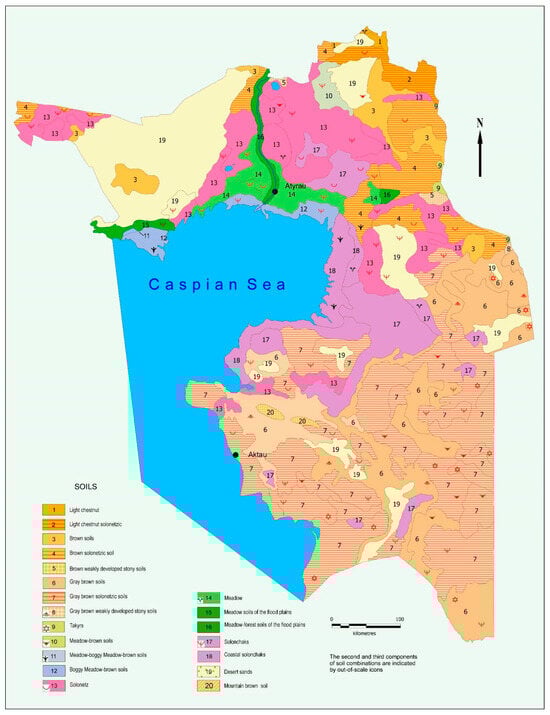 - Pachikin, K.; Erohina, O.; Adamin, G.; Yershibulov, A.; Songulov, Y. Mapping the Caspian Sea’s North Coast Soils: Transformation and Degradation. In Advances in Understanding Soil Degradation; Innovations in Landscape Research; Saljnikov, E., Mueller, L., Lavrishchev, A., Eulenstein, F., Eds.; Springer: Cham, Switzerland, 2022; pp. 717–736. [Google Scholar] [CrossRef]