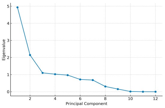 Scree plot of eigenvalues for the principal component analysis (PCA). The first four components exceed Kaiser’s criterion (eigenvalue > 1) and together explain more than 70% of the total variance, confirming their significance for interpretation.