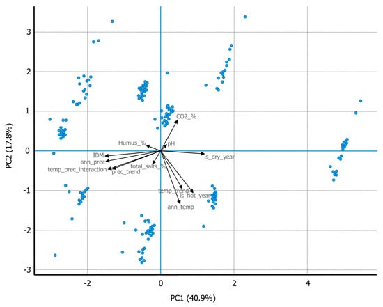 Biplot of the first two principal components (PC1 vs. PC2). Arrows represent variable loadings, while points correspond to individual climate–soil observations.