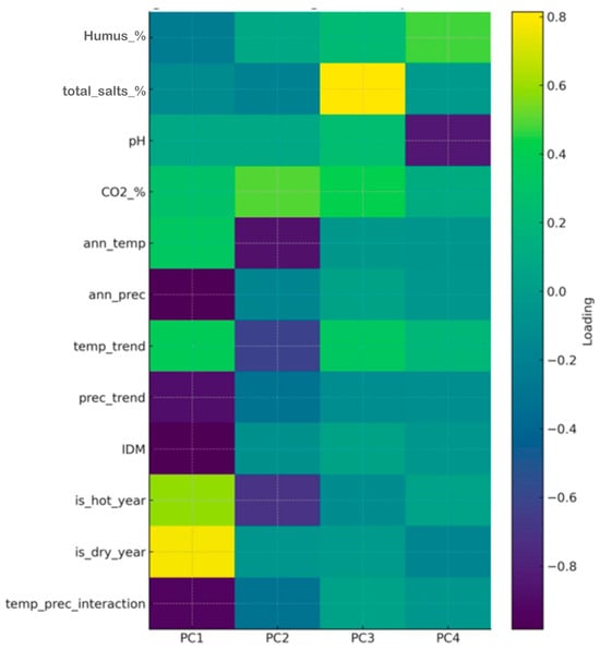 Heatmap of variable loadings for the first four principal components (PC1-PC4) derived from standardized climatic and soil variables. Each cell represents the Pearson correlation coefficient between a variable and a principal component (range: −1 to +1). Yellow shades indicate strong positive loadings (>+0.5), dark purple shades indicate strong negative loadings (<−0.5), and green-blue tones correspond to weak or moderate associations near zero. Variables with |loading| > 0.5 were considered significant contributors to the respective component. The heatmap reveals distinct clusters: PC1 is dominated by aridity and extreme-year indicators (e.g., is_dry_year, is_hot_year), PC2 by soil salinity and geochemical properties, PC3 by precipitation-related variables, and PC4 captures secondary interactions involving the temperature-precipitation coupling.