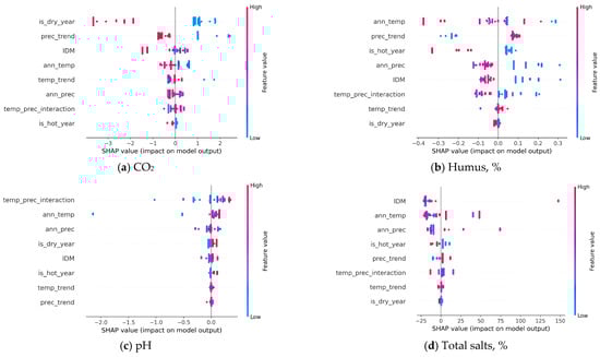 SHAP summary plots for the Random Forest models predicting soil properties: (a) CO2, (b) humus (%), (c) pH, and (d) total salts (%). Each subplot shows the distribution of SHAP values for climatic predictors across 1330 observations; features are ordered by mean absolute SHAP value (global importance). The x-axis displays individual SHAP values, indicating the direction and magnitude of each predictor’s effect on the model output (positive = increases prediction, negative = decreases). The colour scale encodes the feature value (red = high, blue = low), revealing non-linear relationships. Predictors include mean annual temperature (ann_temp), precipitation (ann_prec), their trends (temp_trend, prec_trend), the moisture/aridity index (IDM), extreme-year indicators (is_hot_year, is_dry_year), and the temperature–precipitation interaction (temp_prec_interaction). The plots reveal that aridity-related indicators (is_dry_year, IDM) and long-term temperature trends exert the strongest influence on soil composition, highlighting their role as key drivers of regional degradation processes.