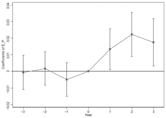 The triple-difference model employed in this study relies on the parallel trends assumption, implying that prior to the establishment of municipal environmental courts, the difference in supply chain financing between polluting and non-polluting enterprises was insignificant. However, following the progressive establishment of city-level environmental courts, polluting enterprises exhibited significantly different supply chain financing levels compared to non-polluting enterprises. Temporal dummy variables spanning three years before and after court establishment were constructed to examine dynamic effects. Figure 1 indicates statistically insignificant coefficients for E_P in pre-establishment years (Year = −3, −2, −1), whereas post-establishment years (Year = 1, 2, 3) show significant coefficients, confirming satisfaction of the parallel trends assumption.