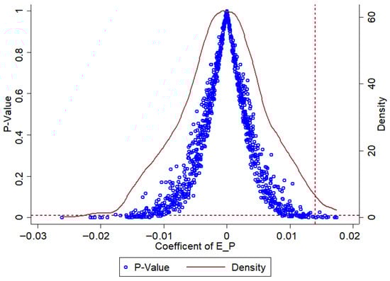 This section further implements a placebo test to alleviate endogeneity concerns regarding the relationship between intensified environmental regulation from court establishment and enterprise supply chain financing []. Specifically, random dummy assignments for court establishment status and timing were applied to each city, maintaining identical annual establishment counts versus actual data. Regression analysis was then performed on these pseudo-samples to obtain coefficients for the interaction term between the dummy court variable and polluting enterprise dummy. After 1000 simulation iterations, kernel density distributions and p-values were reported (Figure 2). Results demonstrate simulated coefficients centered near zero with significant deviation from the true coefficient, indicating that the identified effect of court establishment on polluting enterprises’ supply chain financing is unlikely coincidental, thereby mitigating endogeneity concerns for the main findings.