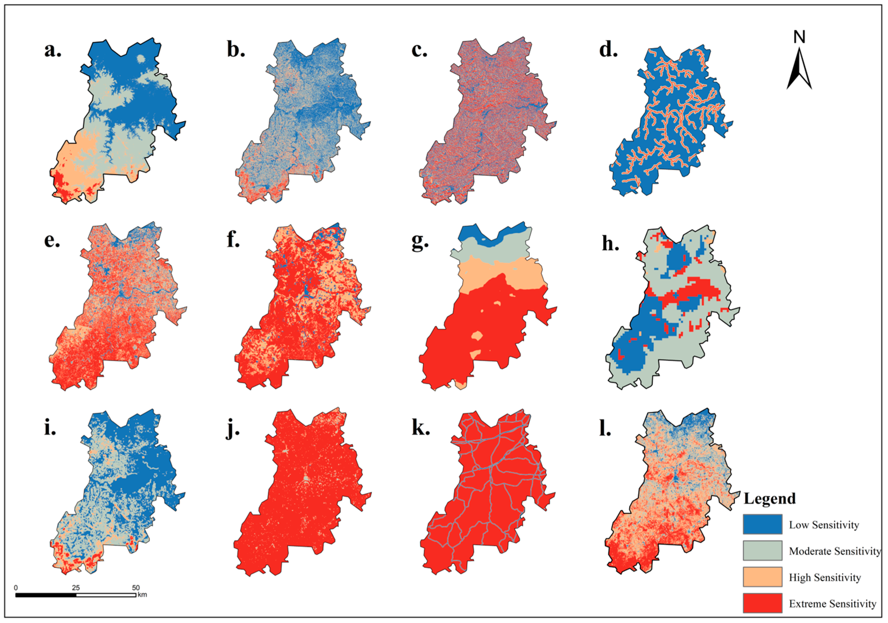 - Chen, J.; Wang, S.; Zou, Y. Construction of an ecological security pattern based on ecosystem sensitivity and the importance of ecological services: A case study of the Guanzhong Plain urban agglomeration, China. Ecol. Indic. 2022, 136, 108688. [Google Scholar] [CrossRef]