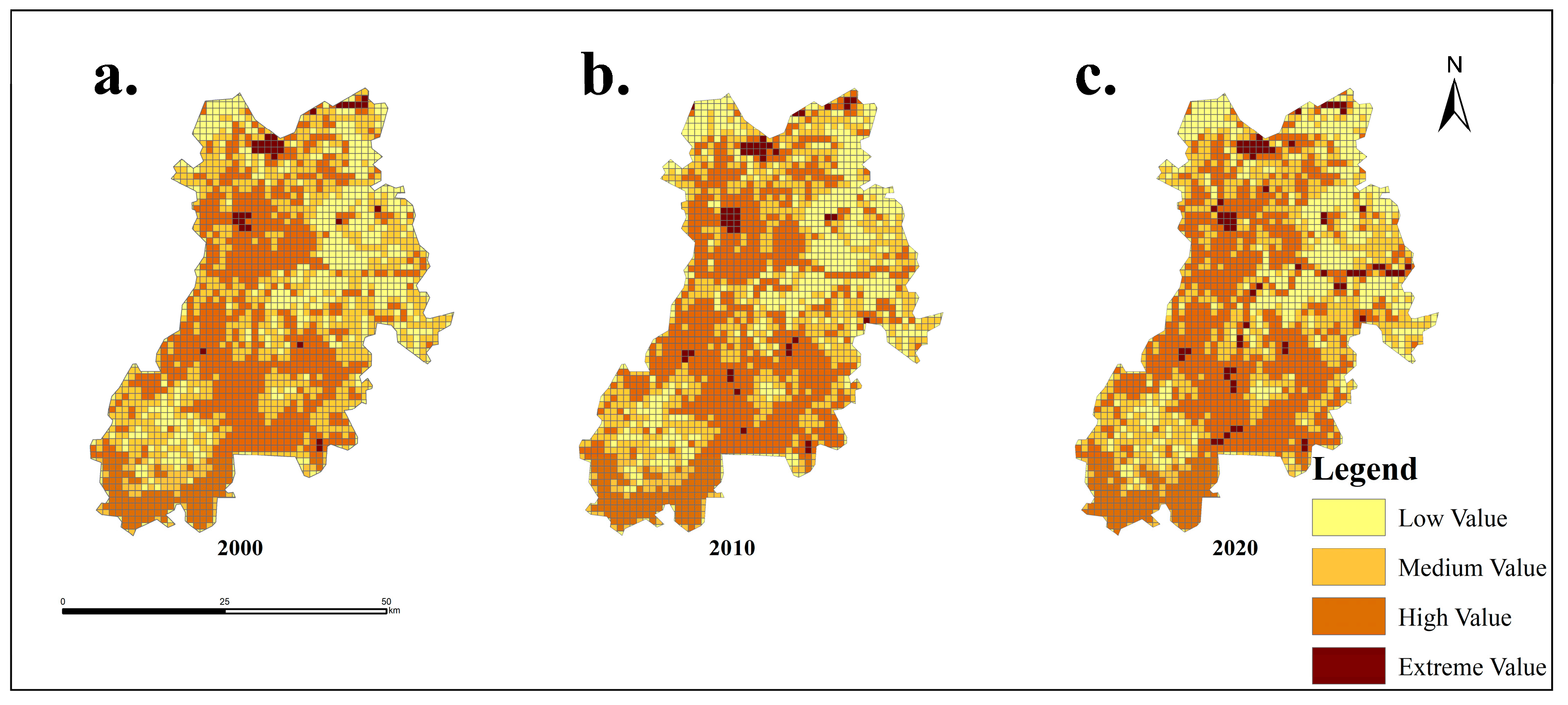 - Rapid expansion of construction land was observed, particularly after 2010, with an overall increase of 289.81%. Ecological sensitivity exhibited a spatial pattern of “high in the south, low in the north,” indicating that southern regions are more vulnerable to environmental changes. ESV displayed significant spatial differentiation, with higher values in the central–southern region and lower values in the northeast, showing an overall increase of 424 million Chinese Yuan.