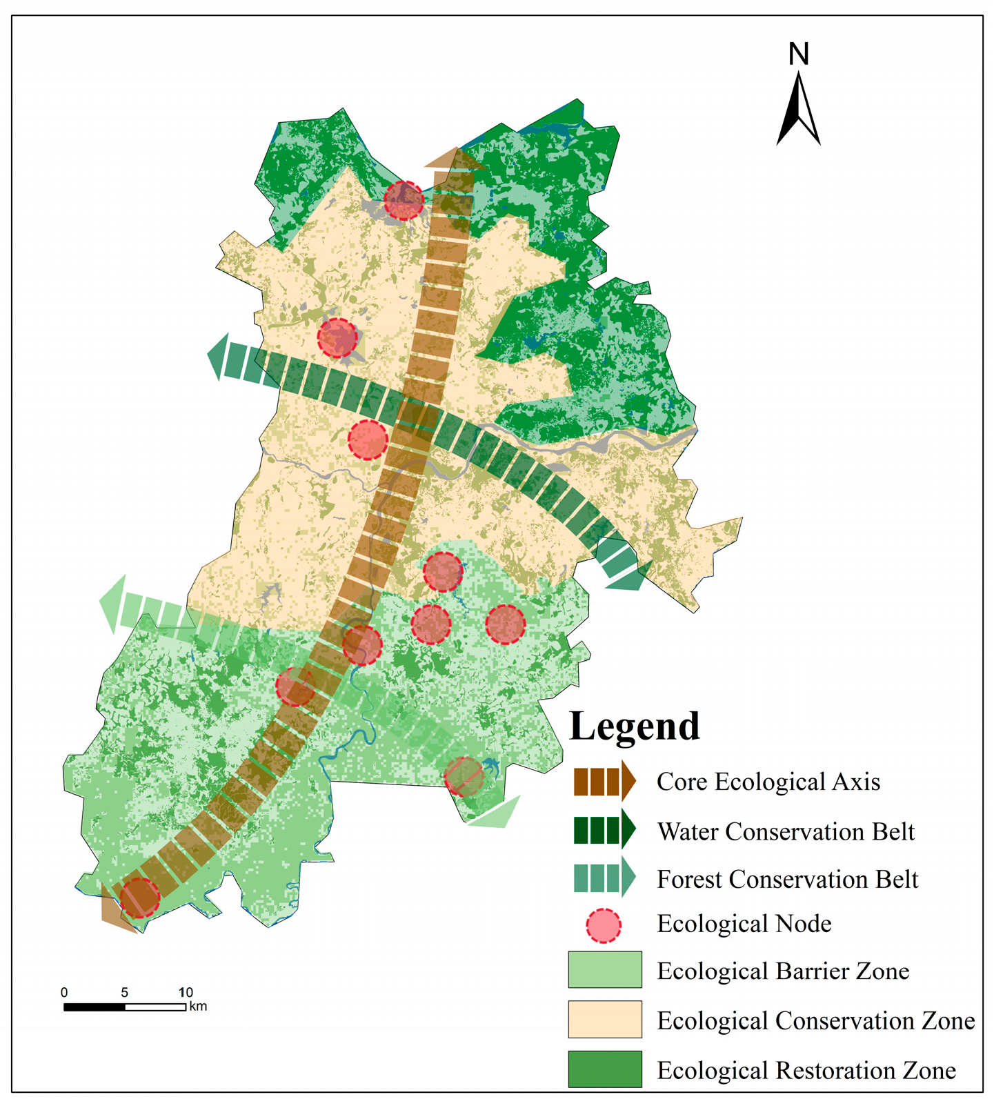- Meng, H.; Gong, Z.; Qian, C.; Zhao, X.; Liu, Q.; Bu, X.; Shen, C. Deciphering the spatial code: Identification and optimization of ecological security pattern—A case study of Jiangsu province, China. Land 2025, 14, 1928. [Google Scholar] [CrossRef]