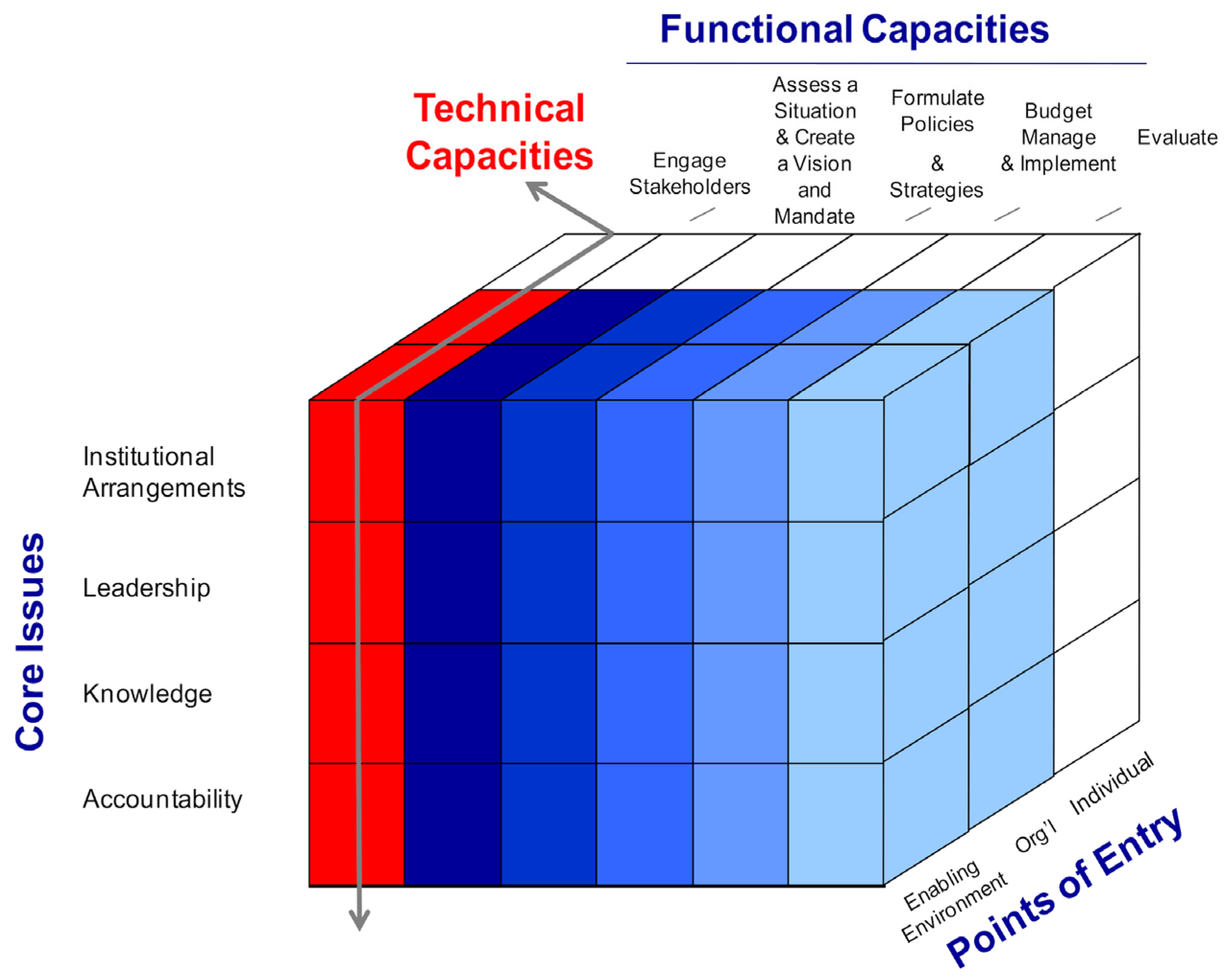 Based on Figure 1, its three core dimensions are as follows: (1) Points of Entry, which defines the level of our analysis. Consistent with the framework, we selected the organizational level as our primary point of entry, focusing on government institutions and their partners; (2) Core Issues is the vertical axis (Institutional Arrangements, Leadership, Knowledge, Accountability), which provided the thematic foundation for our qualitative data collection. Questions in Focus Group Discussions (FGDs) and in-depth interviews were designed to explore these specific issues within the context of green economy agenda-setting; (3) Functional and Technical Capacities is a horizontal axis that guides the identification of specific competency gaps and needs. It helped frame what types of capacities (e.g., formulating policies, managing budgets, and evaluating outcomes) were most critical for policymakers.