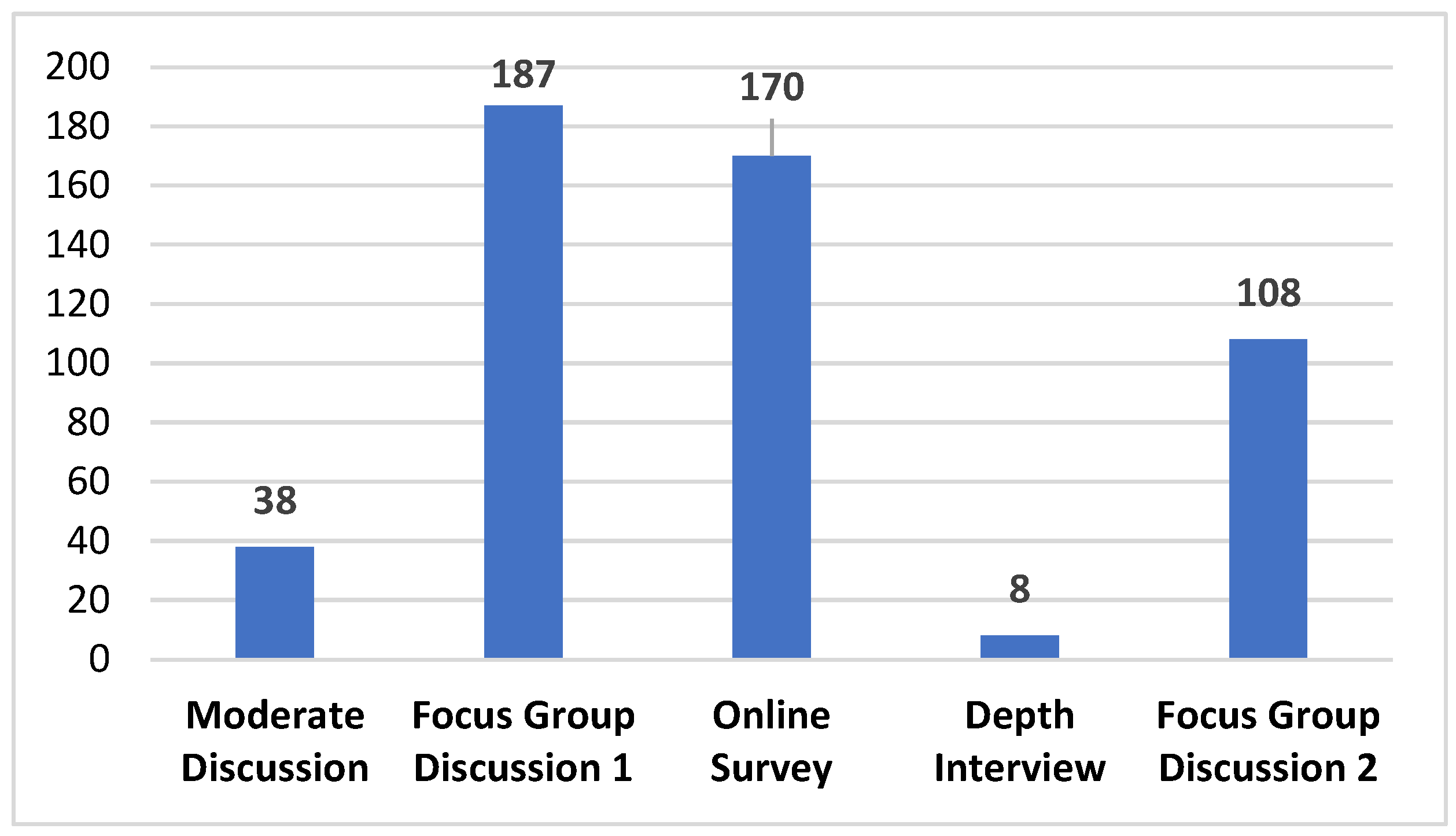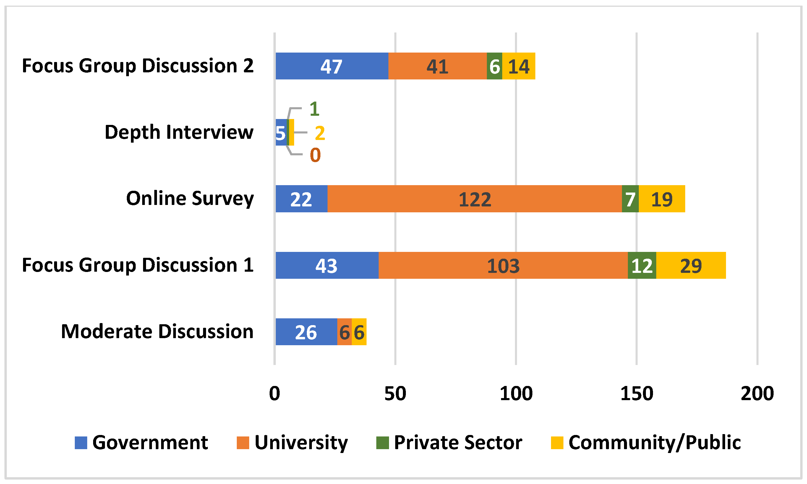 A multi-channel engagement process combined qualitative and quantitative methods to collect comprehensive data from diverse stakeholders—government agencies, academia, the private sector, and community organizations. Qualitative insights were obtained through workshops, FGDs, and interviews, complemented by survey data for quantification. In the quantitative phase, surveys were used to measure key variables and statistically test relationships. A purposive sampling strategy was applied across all data collection methods based on expertise, institutional roles, and relevance to green-economy policymaking [25]. This purposive and exploratory design suited the goal of identifying effective “points of entry” for capacity development.