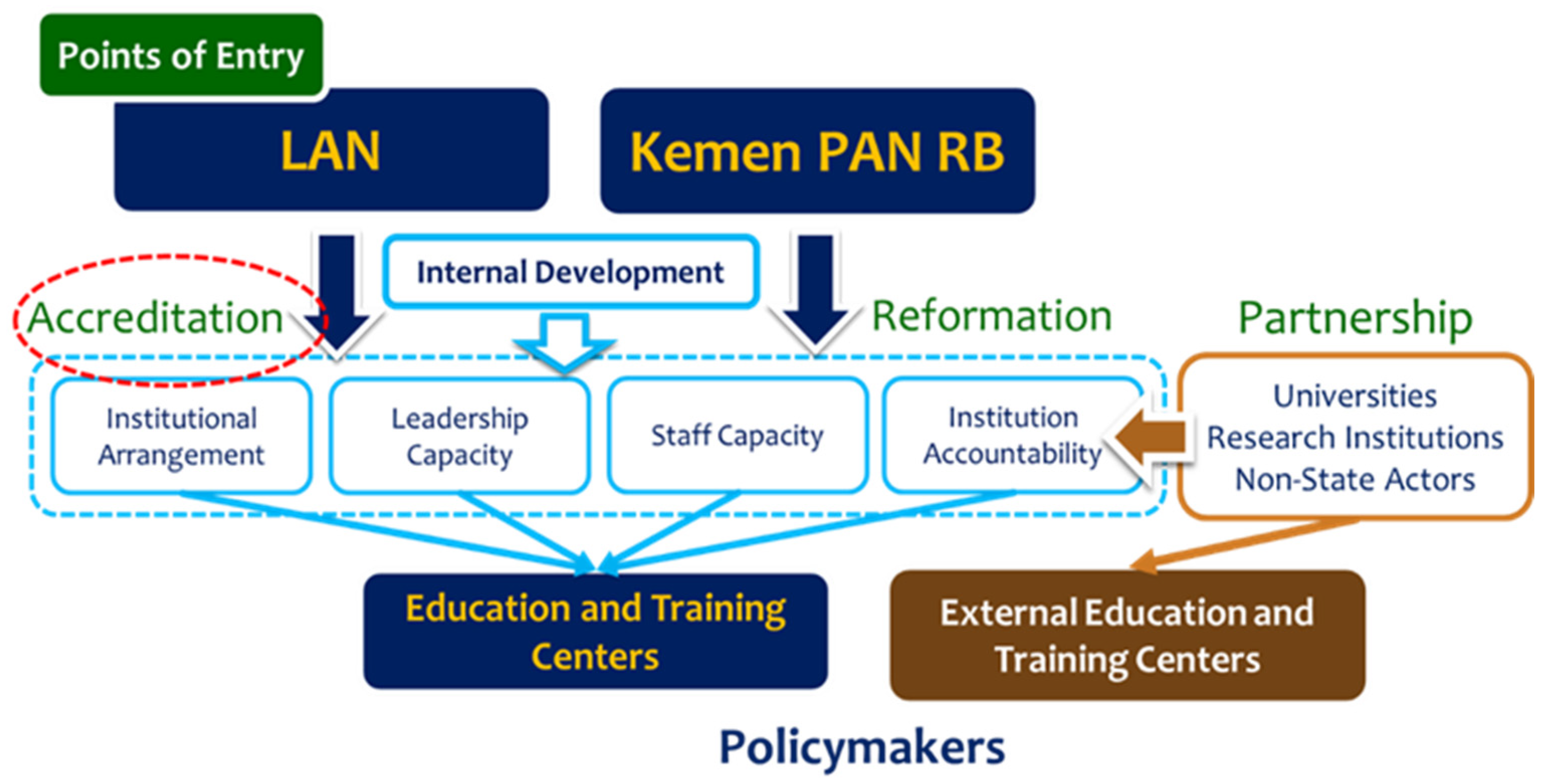 Key areas were identified as points of entry to enhance institutional capacity for scaling up green economy learning in Indonesia, which consists of internal development, accreditation process, reformation policies, and partnership with external institutions such as universities, research institutions, and Non-State Actors (NSAs) (Figure 4). Internal development for scaling up green economy learning would involve key factors of institutional capacity, including institutional arrangement, leadership capacity, staff capacity, and accountability.