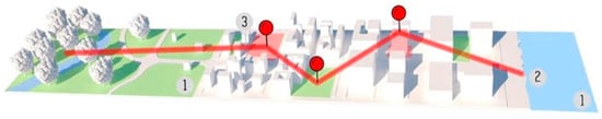Since the enjoyment of the landscape depends on spatial knowledge, the landscape matrix of planning strategies can be implemented through the choice of an approach such as the experiential transect (Figure 2). In geography, a transect is a specific method of territorial analysis organised along a linear trajectory: this exploratory procedure requires careful analysis of the various anthropic and environmental elements that contribute to the definition of the landscape structure, studying in sequence the ecological–spatial relationships that connect them [].