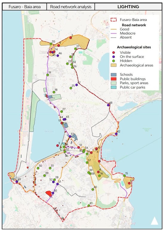Using dedicated road sheets, the main features that influence the functionality and connectivity of the soft mobility system were mapped as well as the actual attractiveness of these connections for users. Specifically, the analysis covered the key physical–perceptual characteristics of the identified transects—dominant use (pedestrian or vehicular), state of maintenance, and existing surfacing—alongside the presence and typology of sidewalks (one- or two-sided, continuous, or intermittent). The study also included dedicated cycling facilities and the degree of pedestrian usability as well as prevailing traffic regimes and the presence and upkeep of bus stops. In parallel, factors affecting the liveability of the experiential transects and their perceived safety were examined, notably lighting adequacy, visible signs of physical decay, and the diffusion of informal safety measures.