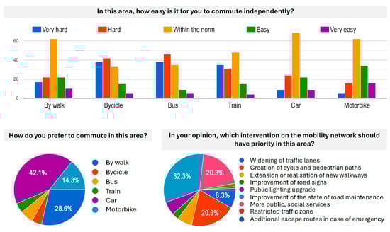 - Mobility and fruition of the socio-cultural assets, focused on modes of travel, access to cultural and ecological assets, perceived ease/difficulty of reaching places, and on-route constraints; this domain was assessed through the following survey items:Q1. In this area, how easy is it for you to commute independently?Q2. How do you prefer to commute in this area?Q3. In this area, how do you rate the accessibility to the main social services (green spaces, municipal offices, schools, museums, libraries, post offices…)?Q4. In this area, how do you rate the accessibility to the ecological and cultural assets (archaeological sites, parks, beaches, lakes…)?Q5. In this area, how do you assess the availability of public parking spaces for motorbikes and cars?