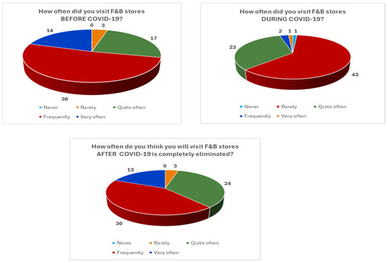 Distribution of respondents’ visits to F&B stores before COVID-19, during COVID-19, and anticipated behavior after COVID-19 is eliminated.