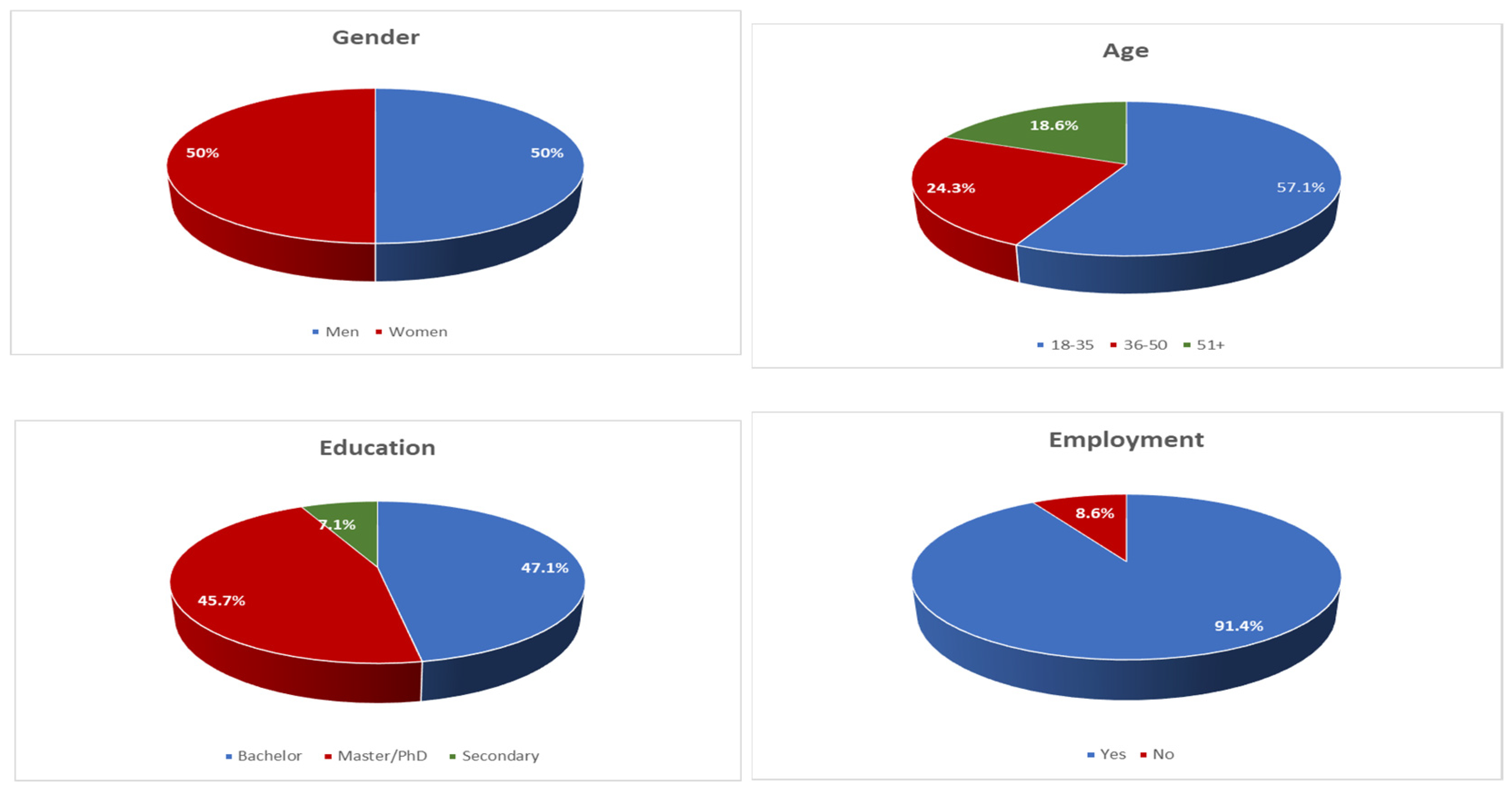 - The ages of the participants were mainly young, as 57% belonged to the 18–35 age group, as shown in the following table, while the most underrepresented group was the 51+ age group.