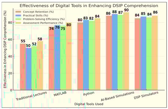 The findings strongly advocate for the integration of digital tools in DSIP education. AI-driven simulations, Python, and MATLAB provide a well-rounded learning experience, enhancing concept retention, practical skills, and problem-solving abilities. Institutions should prioritize technology-driven learning to maximize student outcomes in DSIP.