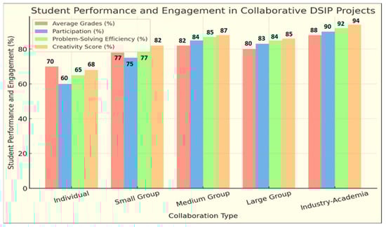 The analysis of student engagement in collaborative activities and their performances in DSIP projects is depicted in Figure 4. It accentuates the impact of the various collaborative formats in determining academic performance, efficiency in solving problems, and creativity.