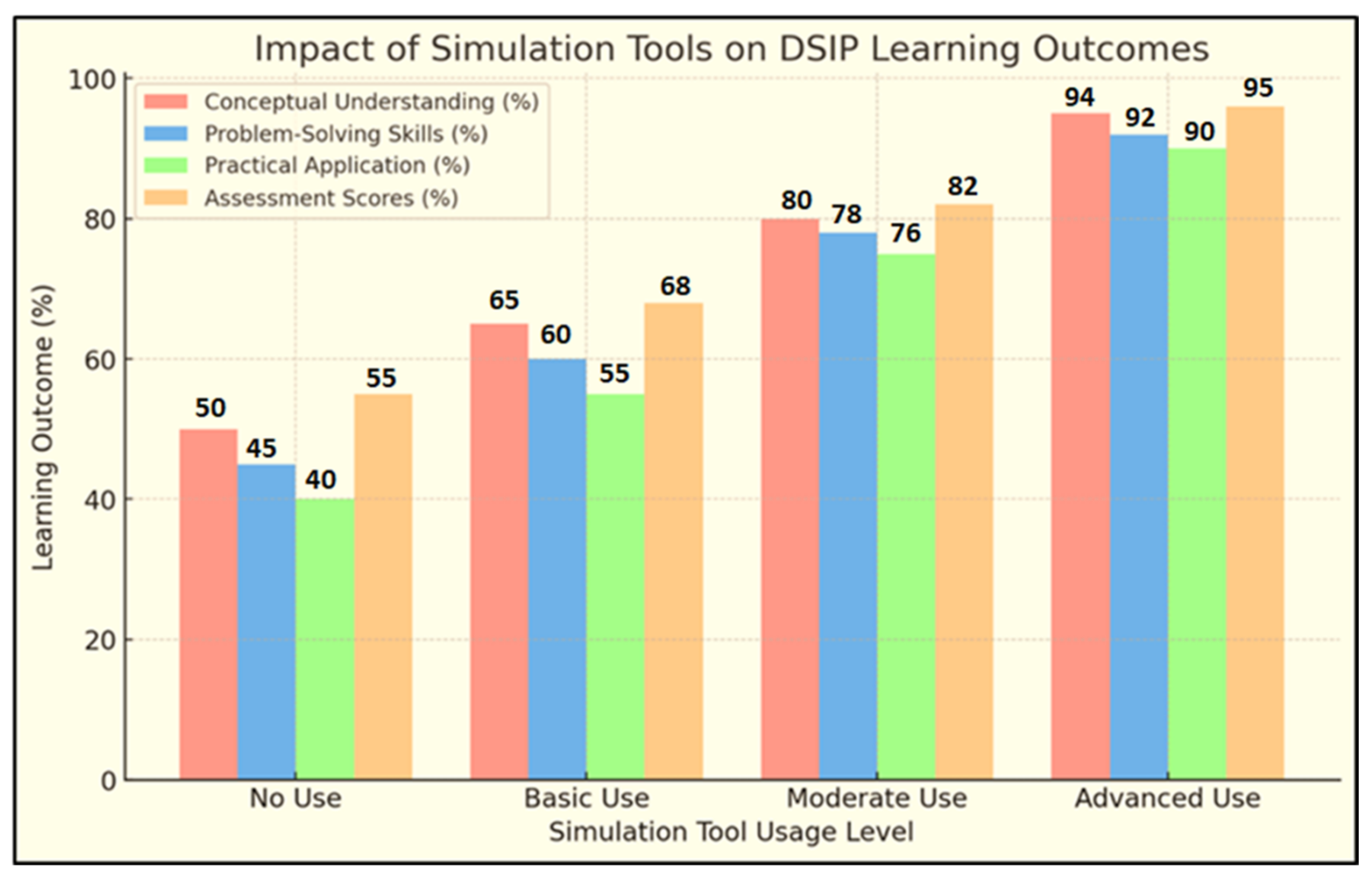 The graph in Figure 2 illustrates how the increasing use of simulation tools (such as MATLAB, Python, and DSP simulators) influences key learning outcomes in Digital Signal and Image Processing (DSIP) education.