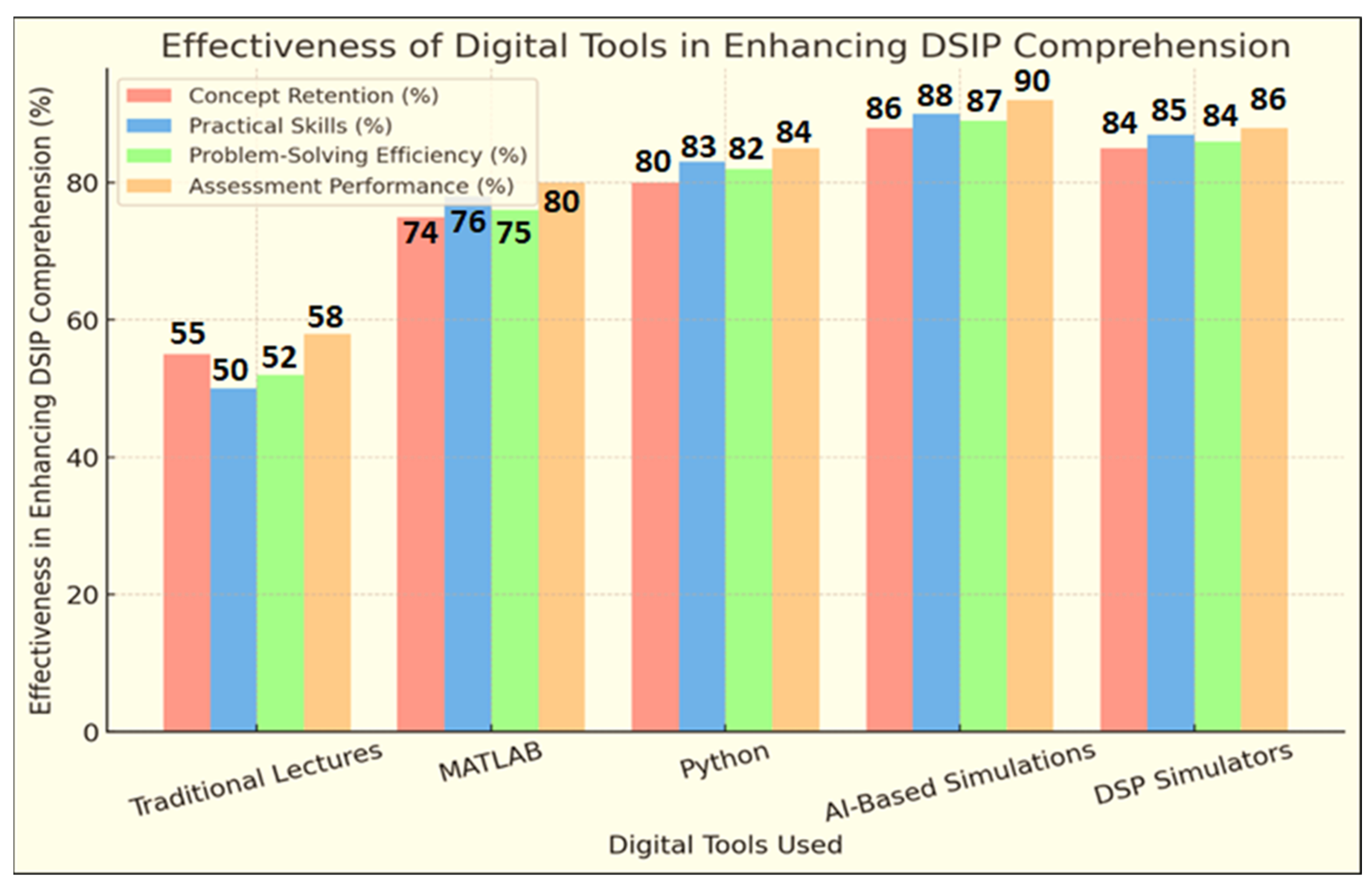The findings strongly advocate for the integration of digital tools in DSIP education. AI-driven simulations, Python, and MATLAB provide a well-rounded learning experience, enhancing concept retention, practical skills, and problem-solving abilities. Institutions should prioritize technology-driven learning to maximize student outcomes in DSIP.