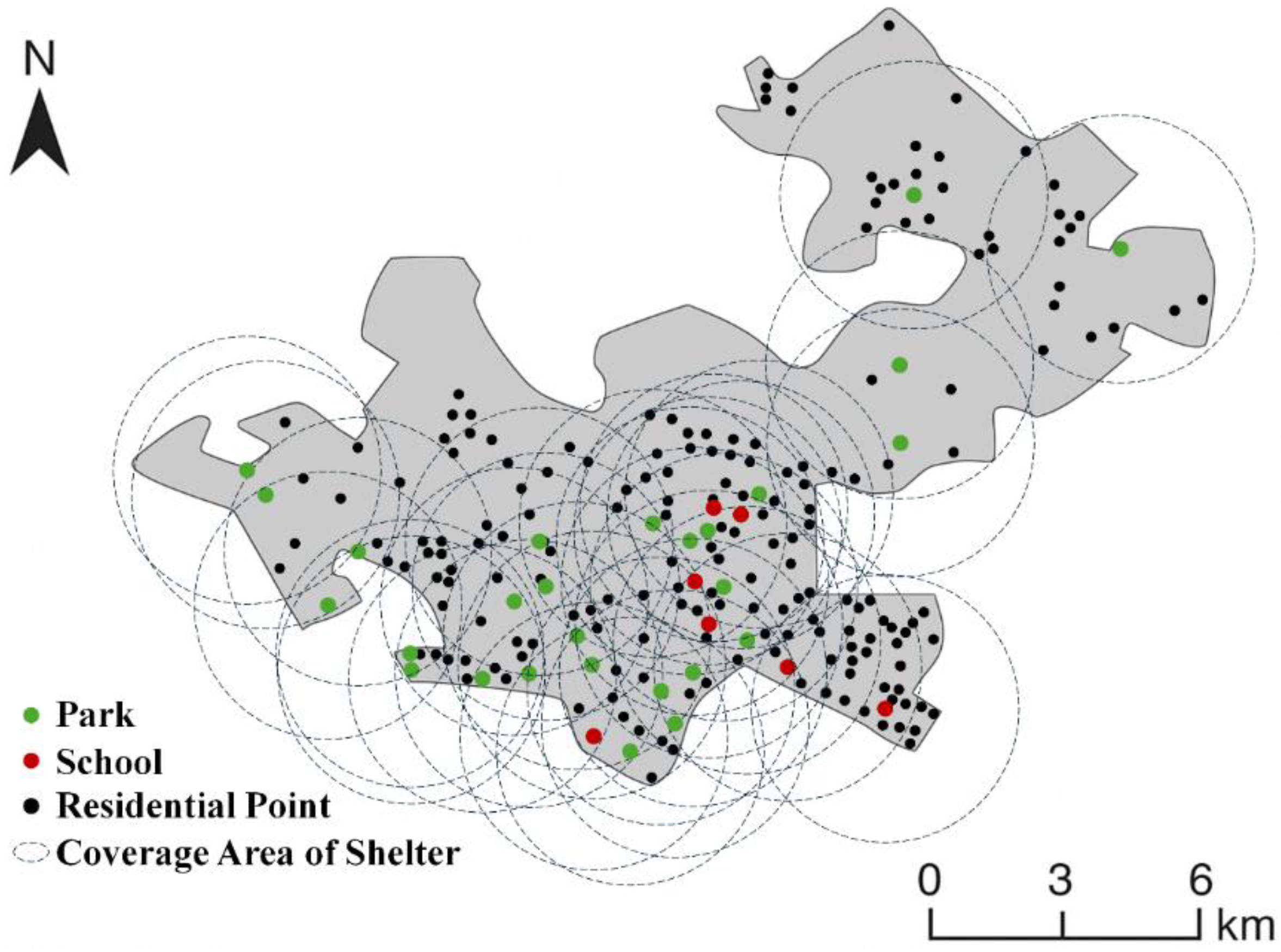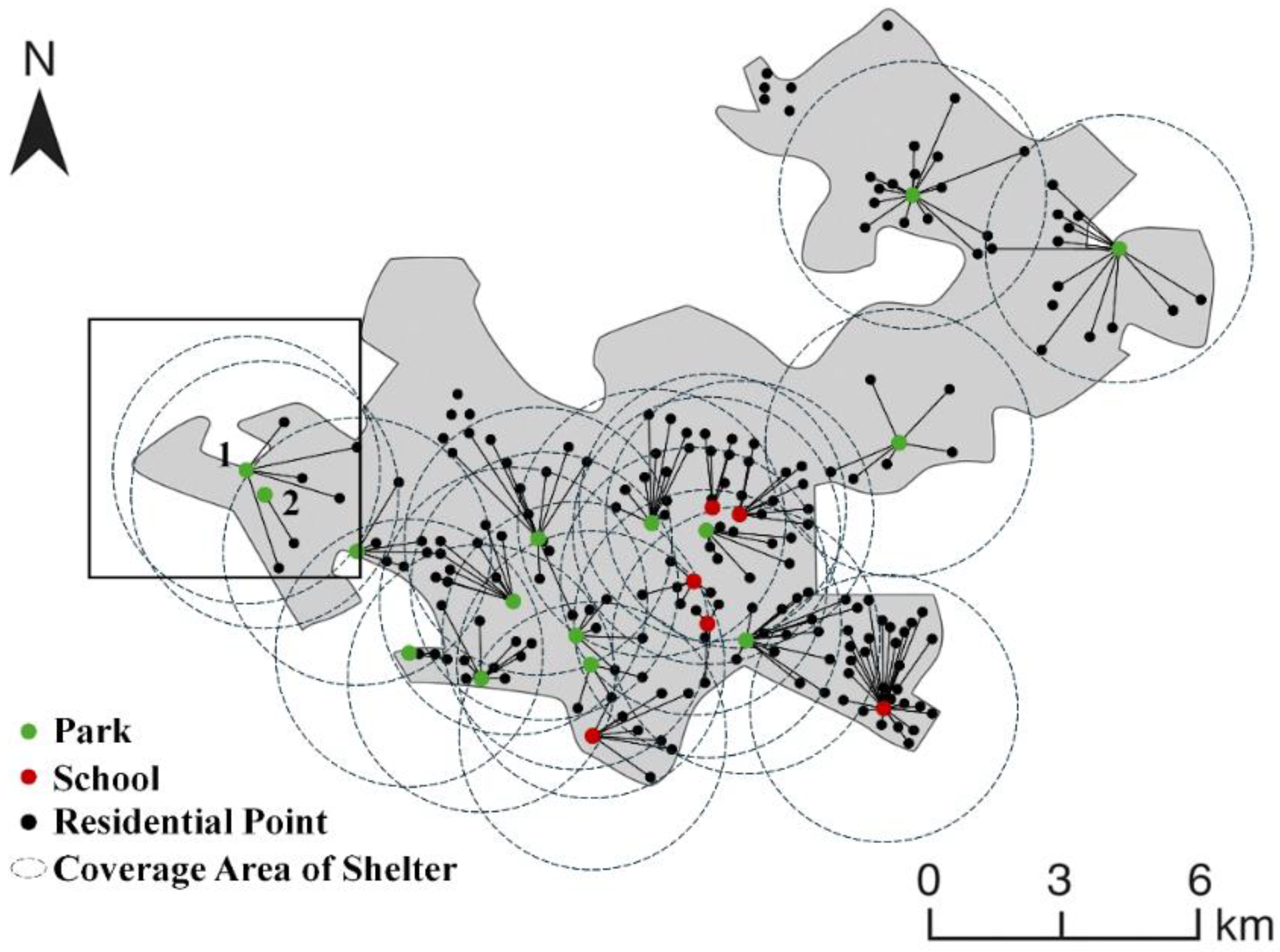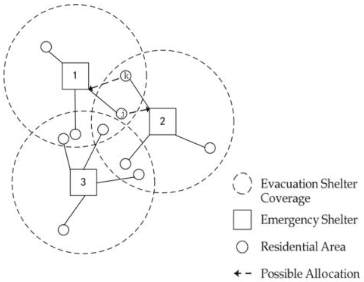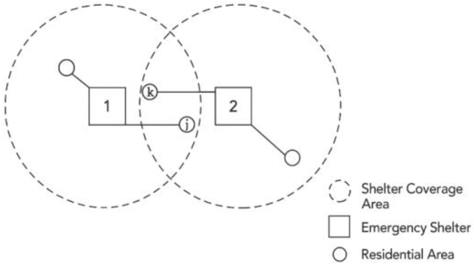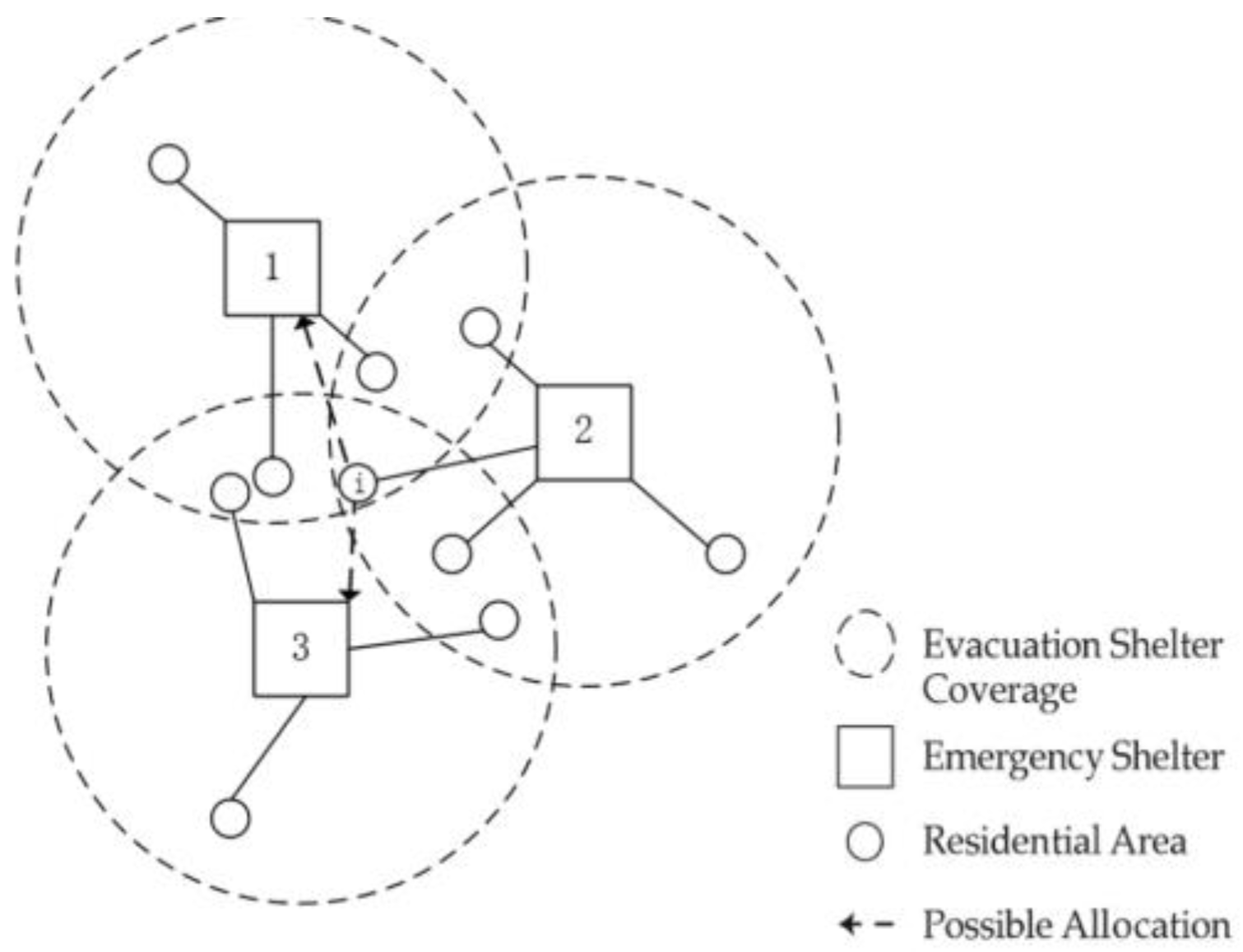 Geographic Information Systems (GIS) are used to compute the actual shortest path distance between residential area i and shelter j. The maximum service coverage radius for shelters is set as L. Residential area i can only be effectively served by shelter j if . Accordingly, we define the coverage sets: as set of residential areas covered by shelter j; as the set of candidate shelters capable of serving residential area i.