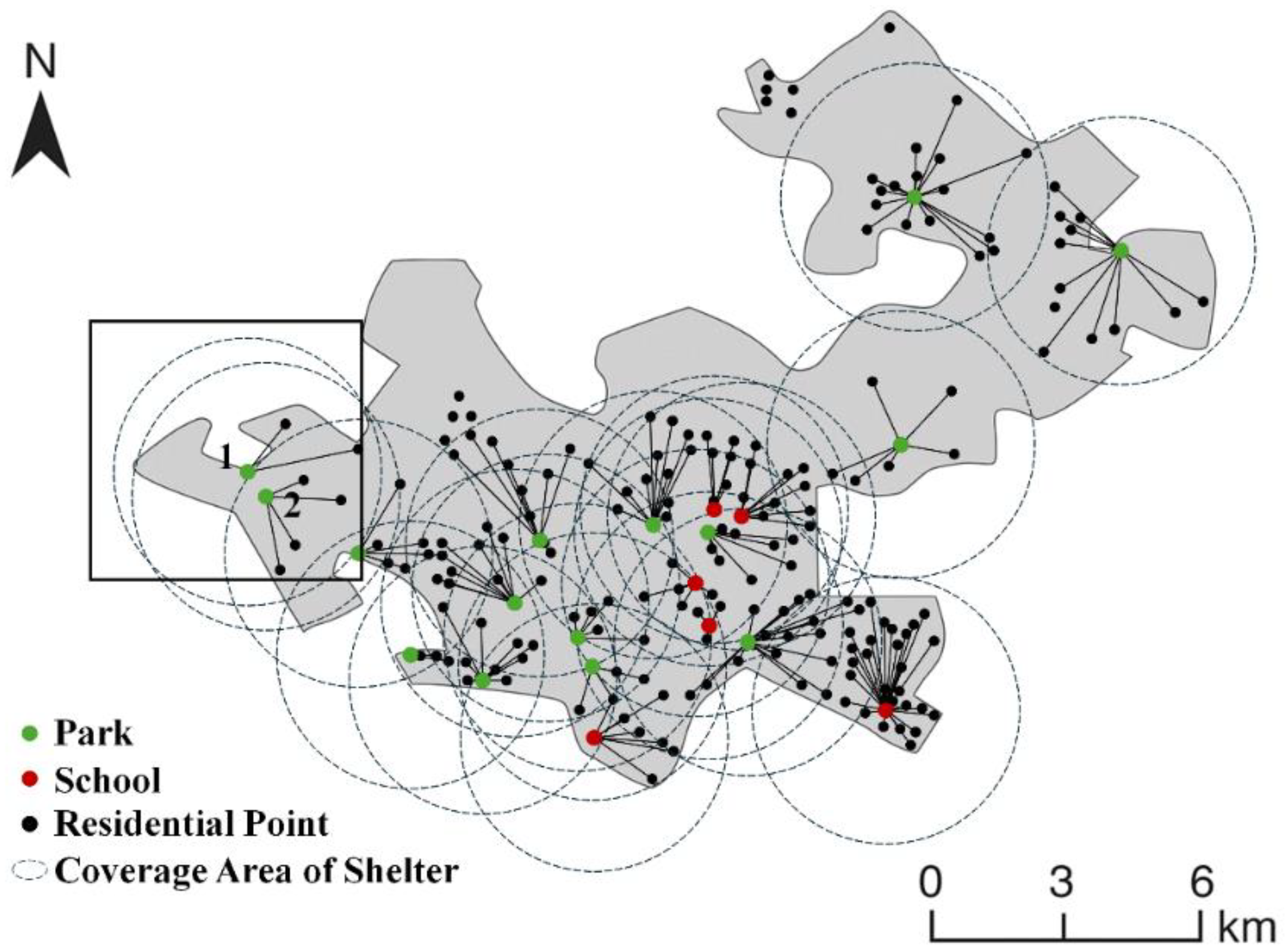 Figure 11 presents the initial shelter location and residential allocation results calculated by the model. As indicated in the figure, some residential areas were not allocated to their nearest shelters. For instance, in the northwest area of the figure, multiple residential communities were grouped around Shelter 1, whereas a closer Shelter 2 served only one community. This outcome, similar to the scenario depicted in